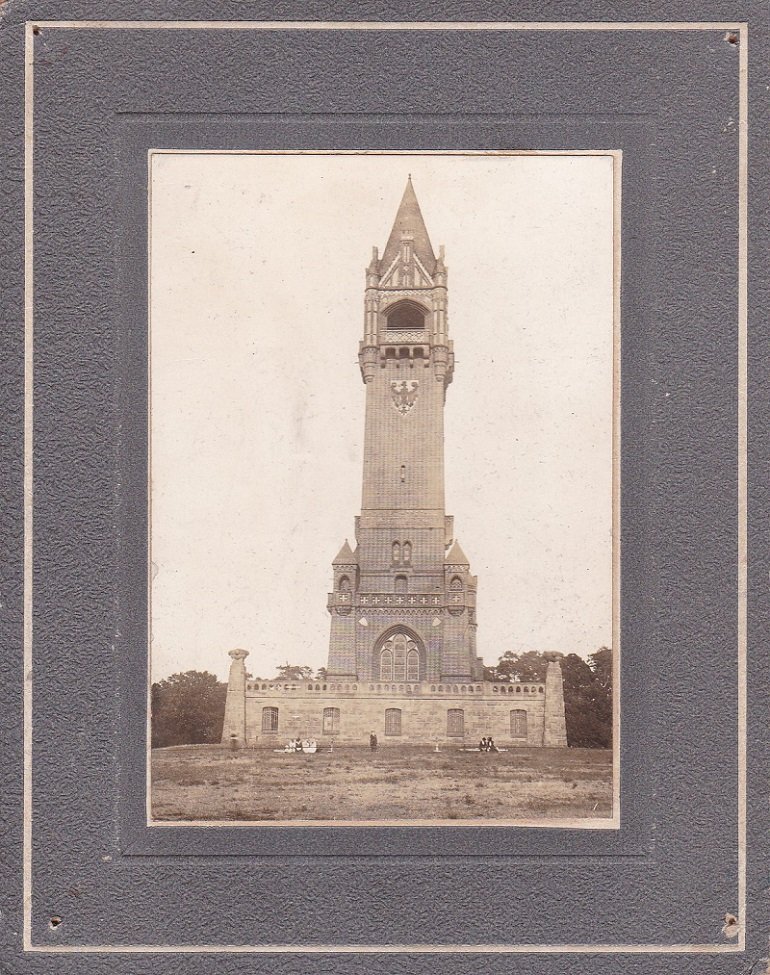 Die Ansicht zeigt den Grunewaldturm in einer Perspektive von unten nach oben. Die Photographie, schwarz-weiss mit leichtem Sepiaton, zeigt auch kleine Menschengruppen sitzend/stehend vor dem Turm. Es handelt sich nicht um eine Ansichtskarte, sondern um eine Ansicht (Photo) aus der Zeit kurz nach der Einweihung des Turms. Der Bau wurde zum 100. Geburtstag des ersten deutschen Kaisers Wilhelm in Auftrag gegeben und hat Krieg und Denkmalsturz überstanden. Das kleine Bildnis war für die heimische Wand gedacht - der Vorbesitzer hatte es an der Wand angebracht (kleine Einstichspuren). Seltene fotografische Archivalie aus der Kaiserzeit!