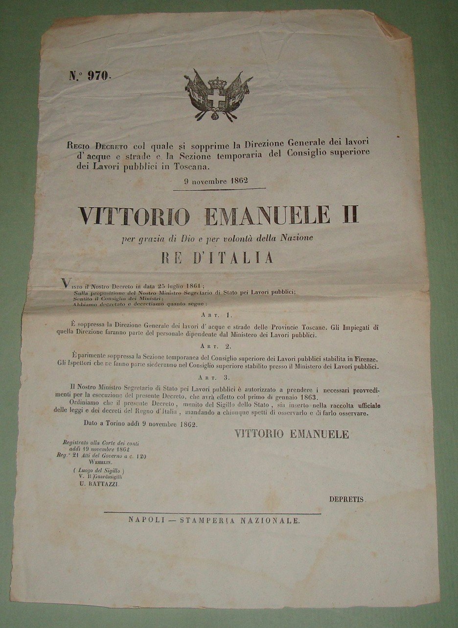 19 Regio Decreto 9 Novembre 1862 col quale si sopprime la Direzione Generale dei lavori di acque e strade e la Sezione temporaria del Consiglio Superiore dei Lavori Pubblici in Toscana.