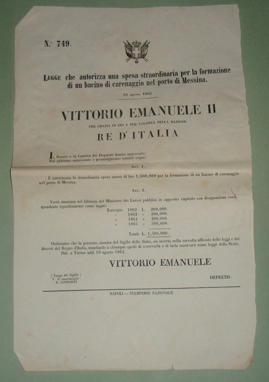 3 Legge 10 Agosto 1862. Autorizzazione di una spesa straordinaria per la formazione di un bacino di carenaggio nel porto di Messina.