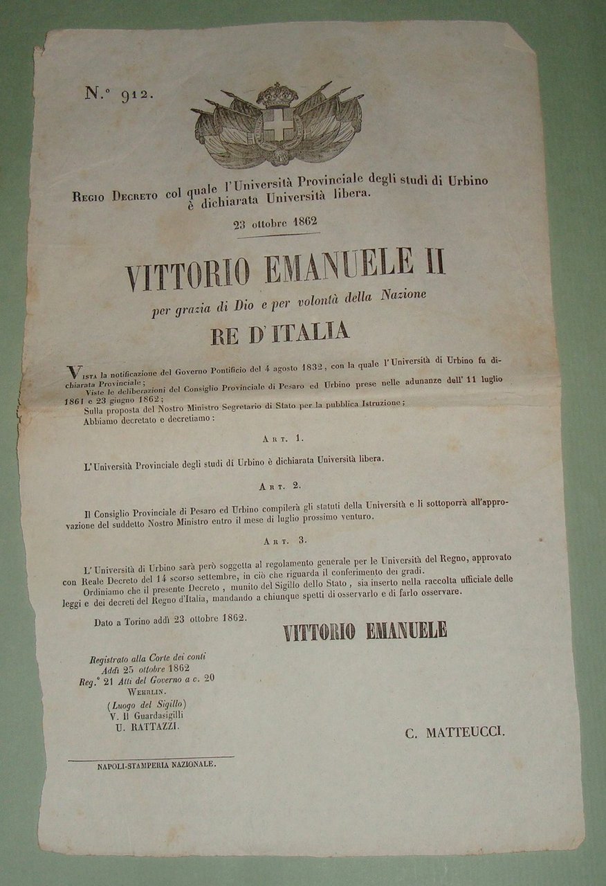 15 Regio Decreto 23 Ottobre 1862 col quale l'università Provinciale degli studi di Urbino è dichiarata Università libera.