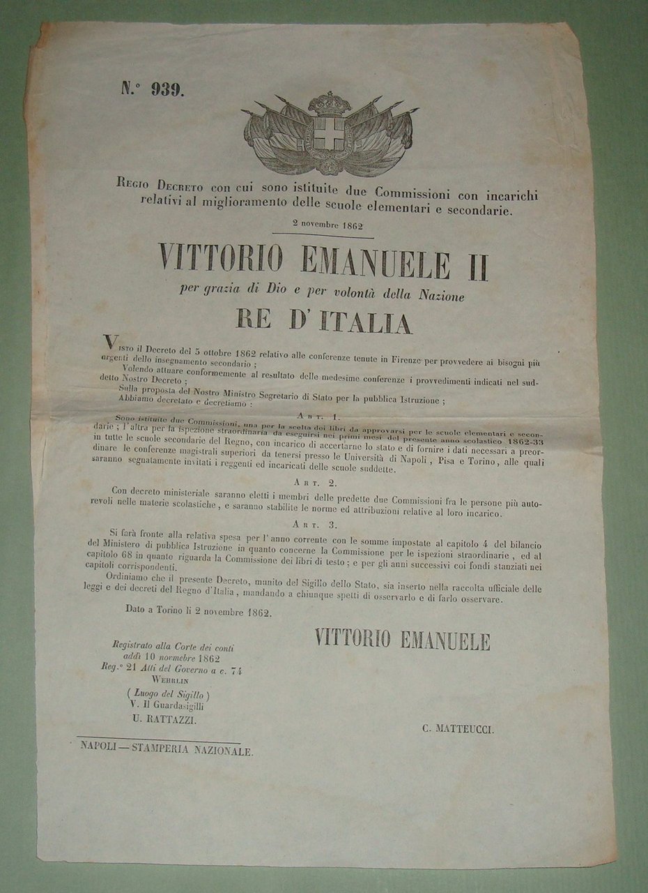 18 Regio Decreto 2 Novembre 1862. Con cui sono istituite due Commissioni con incarichi relativi al miglioramento delle scuole elementari e secondarie.