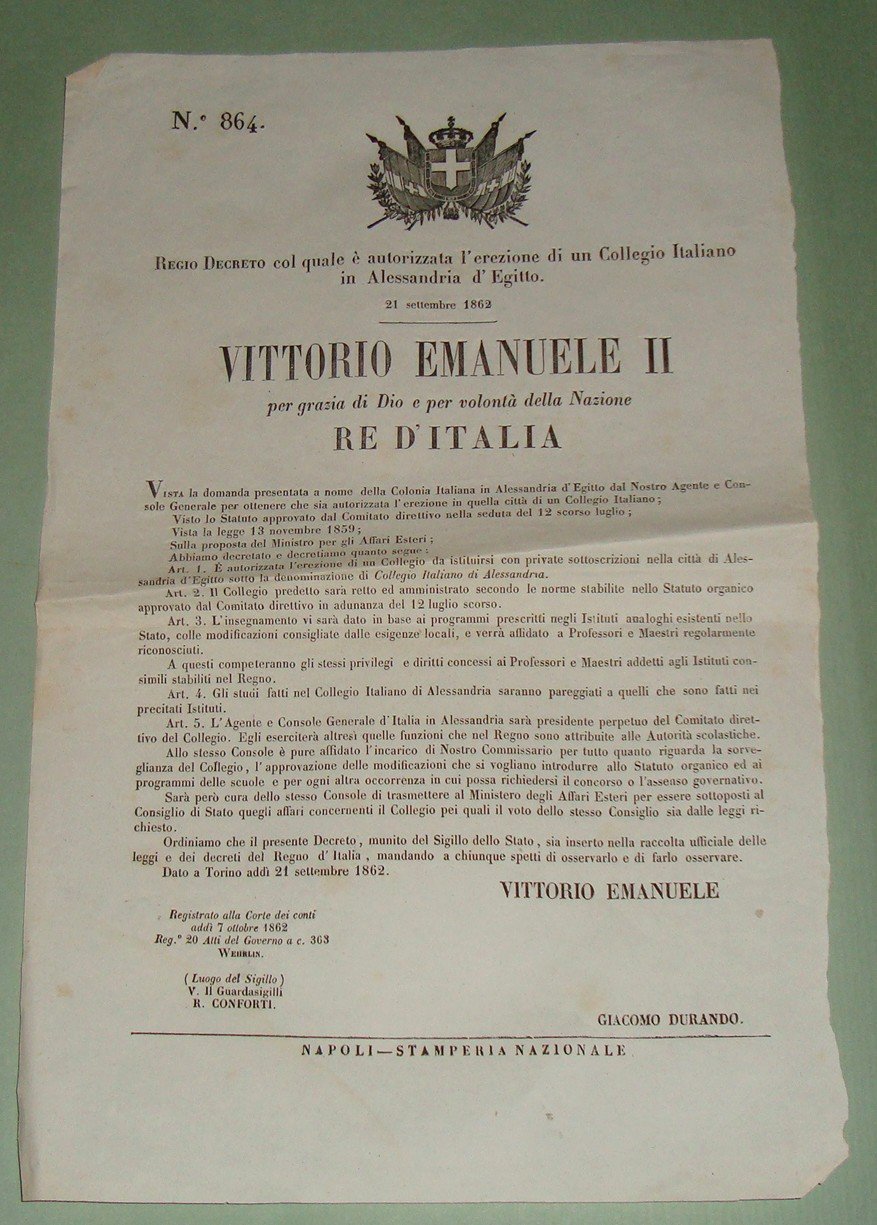 8 Regio Decreto 21 Settembre 1862. Autorizzazione per l'erezione di un collegio italiano in Alessandria d'Egitto.