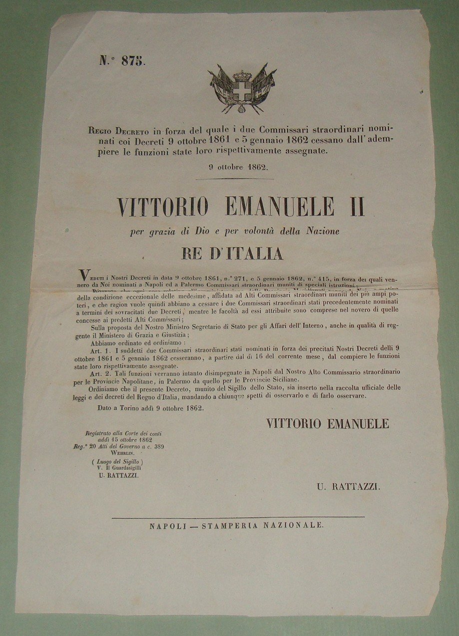 12 Regio Decreto 9 Ottobre 1862 in forza del quale i due commissari straordinari nominati per le città di Napoli e Palermo cessano dall’adempiere le funzioni state loro rispettivamente assegnate.