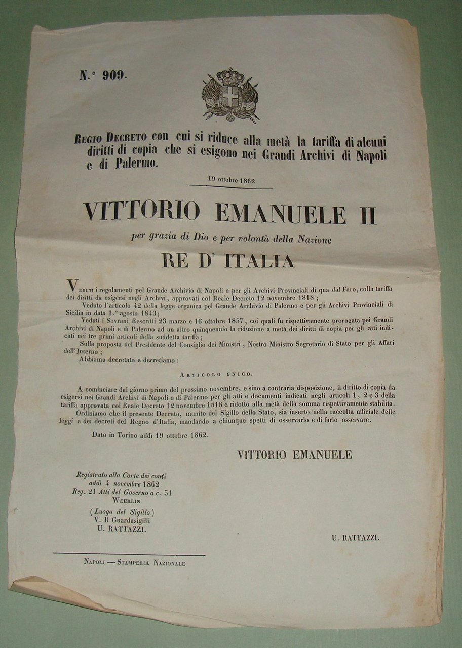 14 Regio Decreto 19 Ottobre 1862. Riduzione alla metà delle tariffe di alcuni diritti di copia che si esigono nei grandi Archivi di Napoli e Palermo.