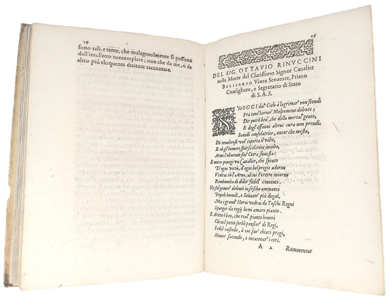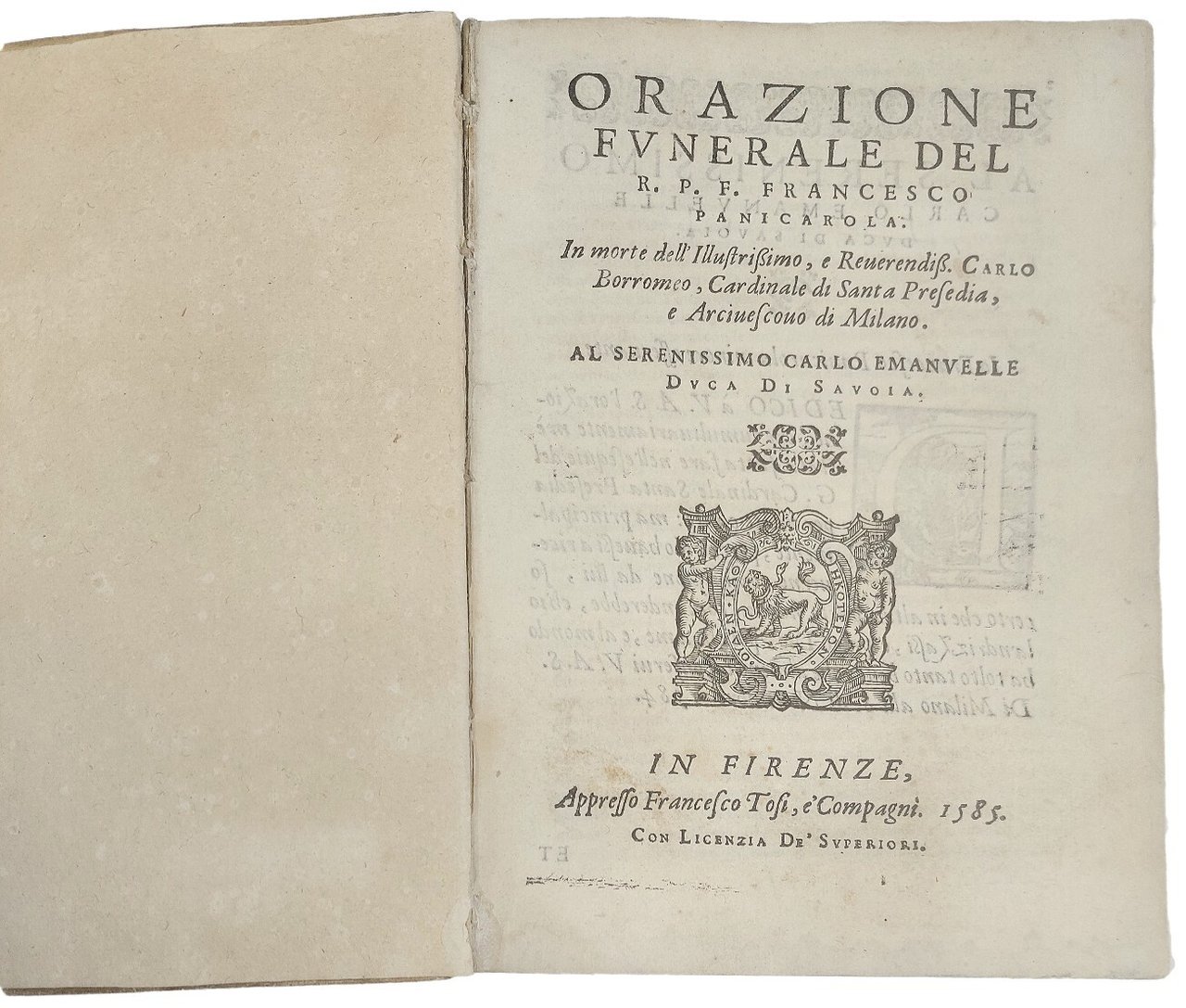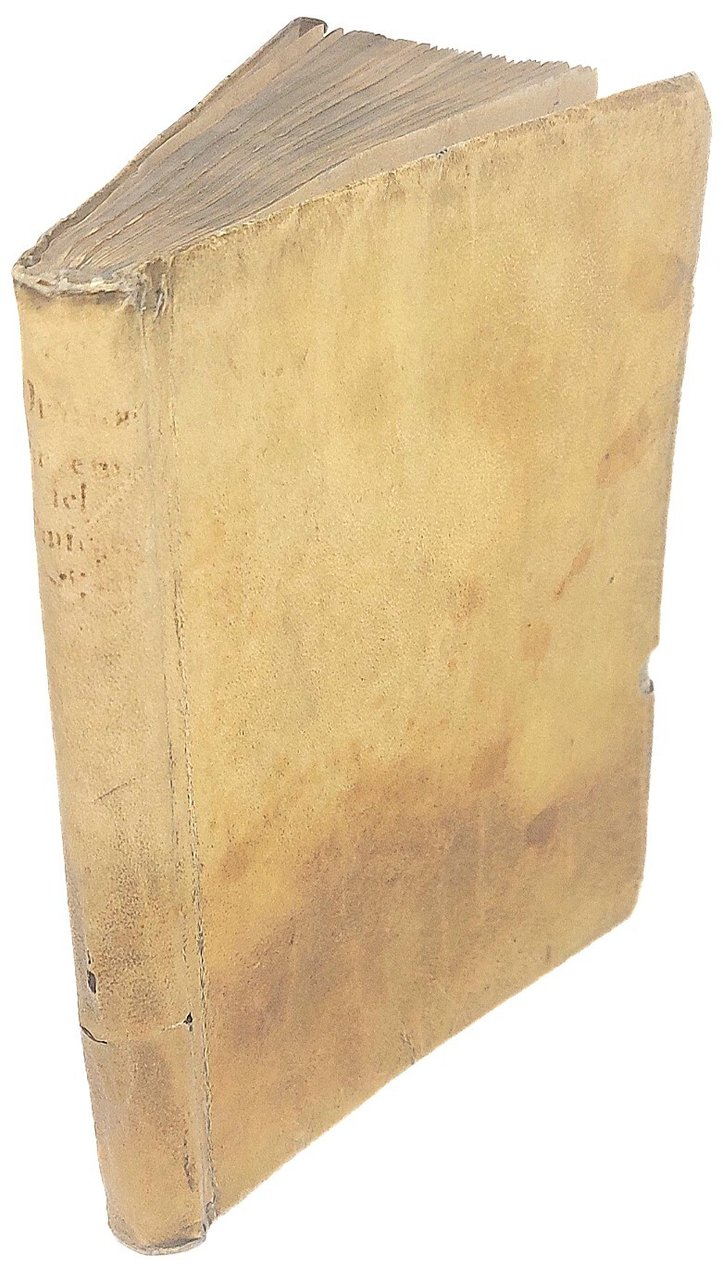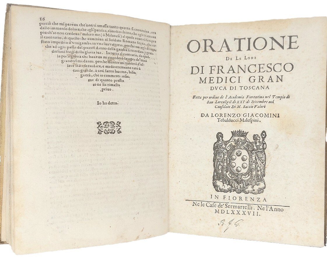>in-4 (215x150 mm), leg. coeva p. pergamena (con piccole mancanze), impresa tipografica sui titoli., iniziali e fregi xilogr. Il volume contiene i seguenti testi: I) PANIGAROLA, Francesco. Orazione funerale in morte dell'Ill.mo , e Rev.mo Carlo Borromeo... Firenze, Franc. Tosi e C., 1585, pp. 16. Seconda edizione, contemporanea ad altra di Brescia, V. Sabbio (la prima era pparsa l'anno precedente a Firenze, presso Dom. Manzani). Manca al BMC e Adams (che registrano altre ediz). II) GIACOMINI, Lorenzo. Oratione de le lodi di Francesco Medici Gran Duca di Toscana... Fiorenza, case de' Sermartelli, 1587, pp. (4), 36. Prima edizione. Manca all'Adams. BMC 299. III) AMMIRATO, Scipione. Orazione al Sant. et Beatiss. Padre...Clemente VIII. Fiorenza, heredi di Iacopo Giunti, 1594, pp. (2), 32, (2 bb.). Prima edizione. Manca all'Adams. BMC 26 (edizione poster.). IV) MINERBETTI, Aless. Orazione in lode del Sig. Cav. Belisario Vinta Senatore, Primo Consigliere, e Segretario di Stato del Gran Duca di Toscana... Firenze, Cosimo Giunti, 1614, pp. 18, (4, le ult. 2 bb.). Prima edizione. Manca a BMC, XVII sec. e Michel-Michel. V) ARRIGHETTI, Niccolò. Delle lodi di Cosimo Secondo Granduca di Toscana. Orazione... Firenze, appresso i Giunti, 1621, pp. 46, (2 bb.). Prima edizione. Manca a Michel-Michel. BMC, XVII sec., p. 51.