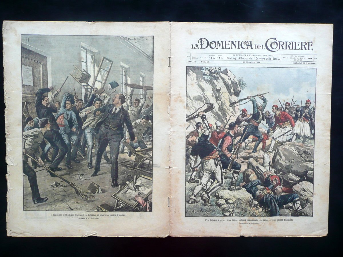 Settimanale, Fra bulgari e greci: una banda bulgara massacrata da bande greche presso Salonicco" Grande illustrazione a colori alla prima pagina de "La Domenica del Corriere" Anno VI - Numero 51 Milano, 18 Dicembre 1904 Milano 1904, cm 38,5x29, pp. 16 con varie ill. in b/n nel t.; prima e ultima pagina entrambe con una bella ill. a colori. Fogli uniti al dorso tramite due punti di spillatura. Numero completo. Condizioni di conservazione Esemplare complessivamente ben conservato con tracce d'uso, alcune piccole lievi bruniture, leggerissime tracce di pieghe di conservazione; margini con alcuni piccoli difetti e strappetti, in pochi casi anche di qualche cm. Numero completo. SC03.D10998 N F "