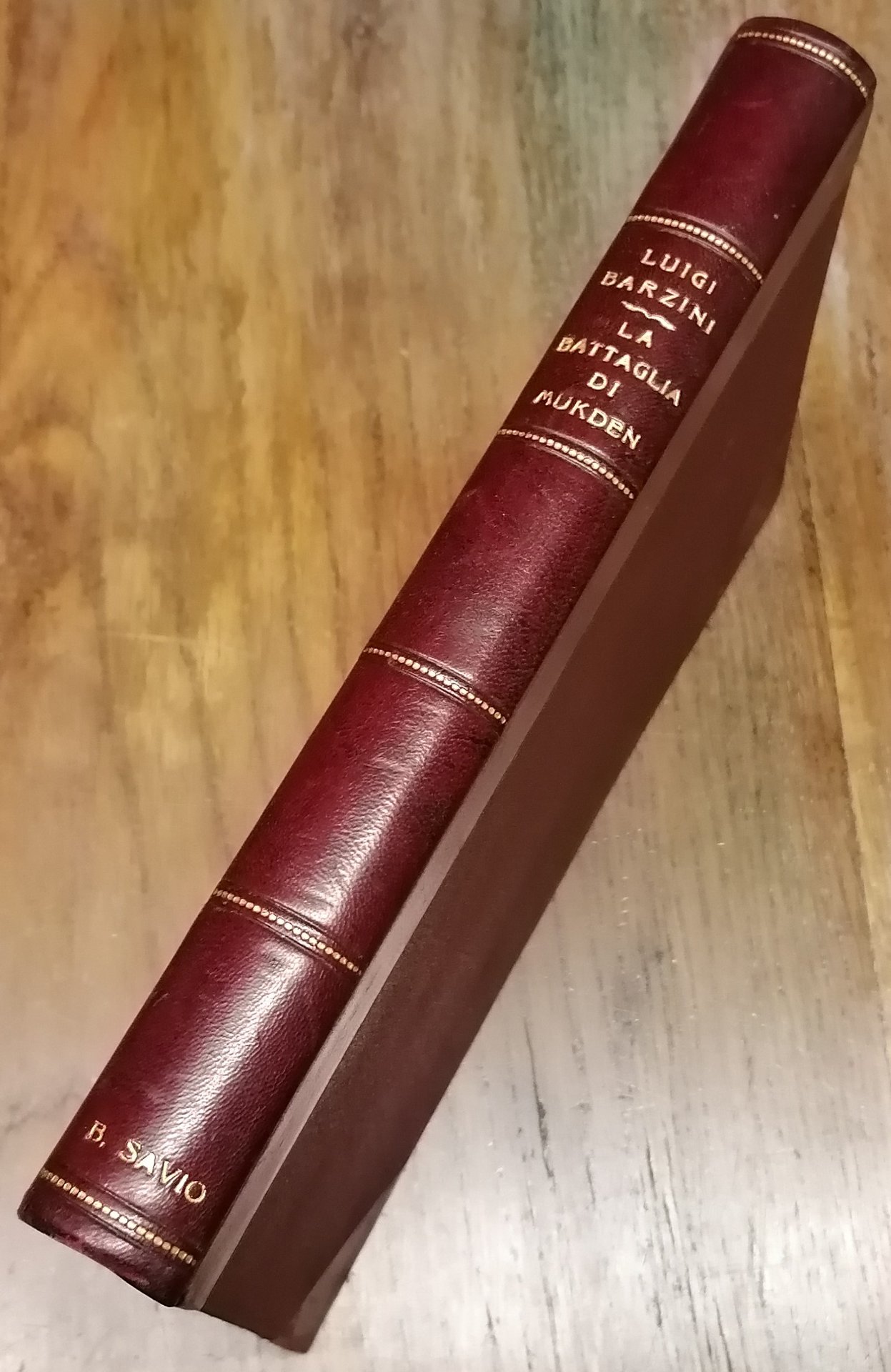 (Battaglia di Mukden febbraio-marzo 1905 - Manciuria - Impero Russo - Giappone - Giornalismo - Corrispondenti di guerra italiani della prima metà del Novecento) In 8°, legatura coeva in mezza pelle bordeaux con punte, titoli e filetti impressi in oro al dorso, guardie in carta decorata a motivo floreale, pp. XIX,(1),294,(2) su carta patinata, con 52 illustrazioni fotografiche in b/n da istantanee prese sul luogo dall'Autore e 15 piante nel testo, una grande carta topografica con rilievi in colore più volte ripiegata conservata in una tasca con alette alla fine del volume ("Disposizione delle forze giapponesi al momento in cui la Battaglia s'inizia" - Carta segreta dell'Armata giapponese "Mukden e dintorni"). Quarto migliaio. Due piccole firme di vecchia proprietà, all'occhiello ed al margine bianco di pag. V. Volume ben conservato in solida legatura con solo lievi ed insignificanti scalfitture alle punte ed alcuni rinforzi alla carta topografica.