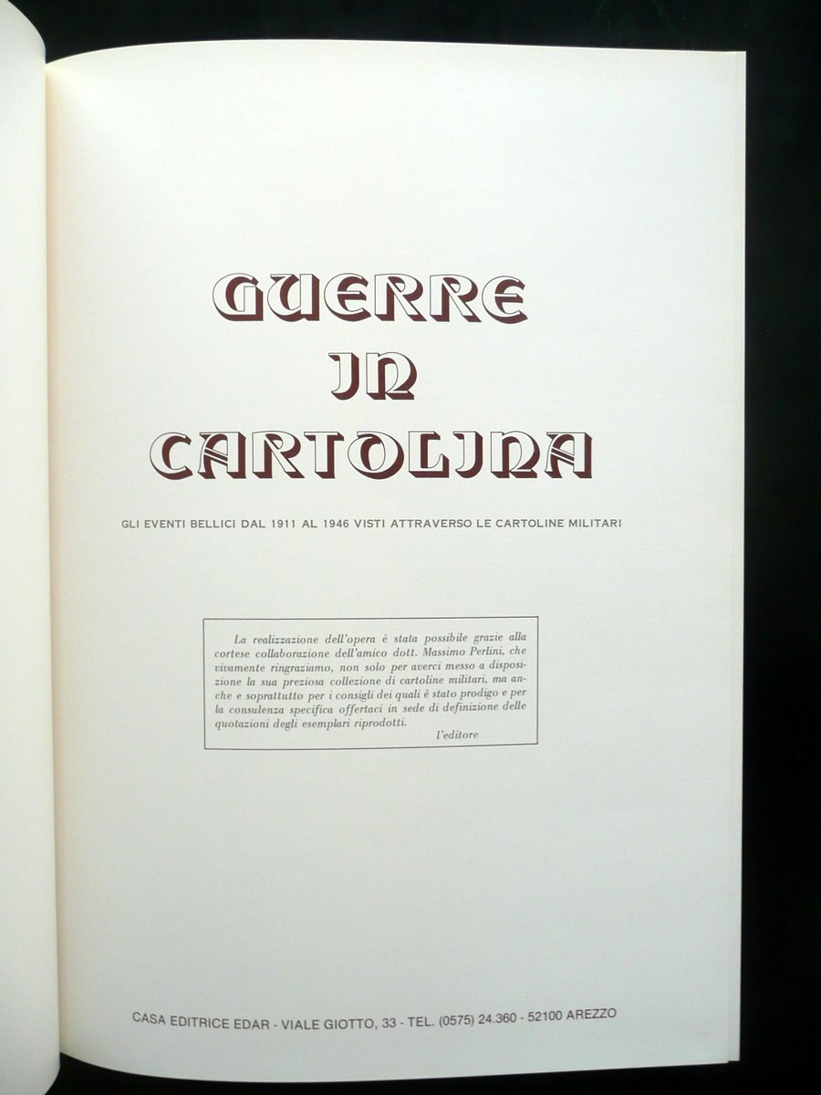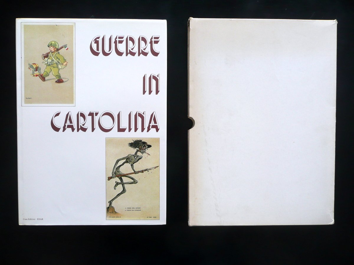 Guerre in Cartolina Gli eventi bellici dal 1911 al 1946 visti attraverso le cartoline militari Casa Editrice Edar, Arezzo 1981, cm 34,5x25, pp. 202 con numerose riproduzioni a colori e in b/n fuori t. di bellissime cartoline militari (vedi foto); piena similpelle ed. con titolo impresso in oro al dorso e al piatto ant.; sovraccoperta ed. ill. a colori. Volume contenuto entro cofanetto ed. in cartoncino muto. Condizioni di conservazione Volume in ottime condizioni con minime tracce d'uso alla sovraccoperta ed. Interni ottimi. Con numerose riproduzioni a colori e in bianco e nero fuori testo di bellissime cartoline militari, spesso realizzate da importanti illustratori del periodo. Esemplare in ottimo stato di conservazione. SETT110.L10574 N