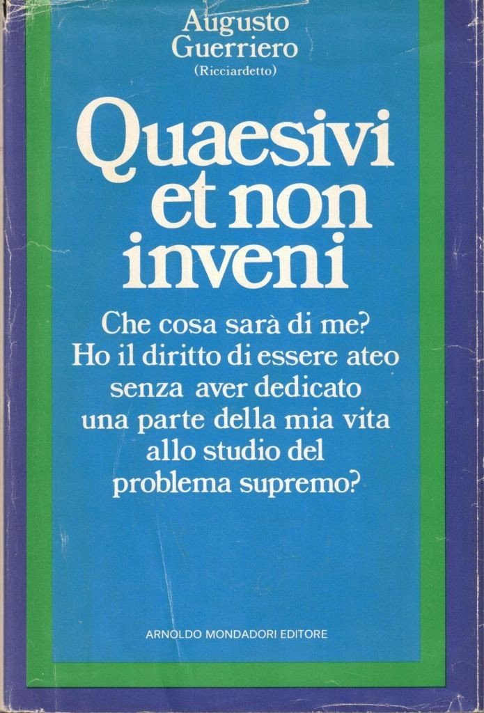 Augusto Guerriero (Ricciardetto), Quaesivi et non inveni, Arnoldo Mondadori Editore, s.l. (ma stampato a Vicenza, presso le Arti Grafiche delle Venezie) 1974, quarta ed., pp. 283, cm 20, cart. ed. con titoli al dorso e sovraccoperta. Sottotitolo alla sovraccoperta: Che cosa ne sarà di me? Ho il diritto di essere ateo senza aver dedicato una parte della mia vita allo studio del problema supremo? Leggere tracce d’uso alla sovraccoperta, per il resto ben conservato.