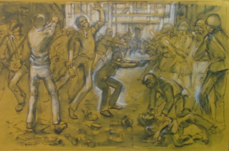 Disegno a china su cartoncino, color ocra, di cm. 31 x 51. Firma in basso a sinistra.