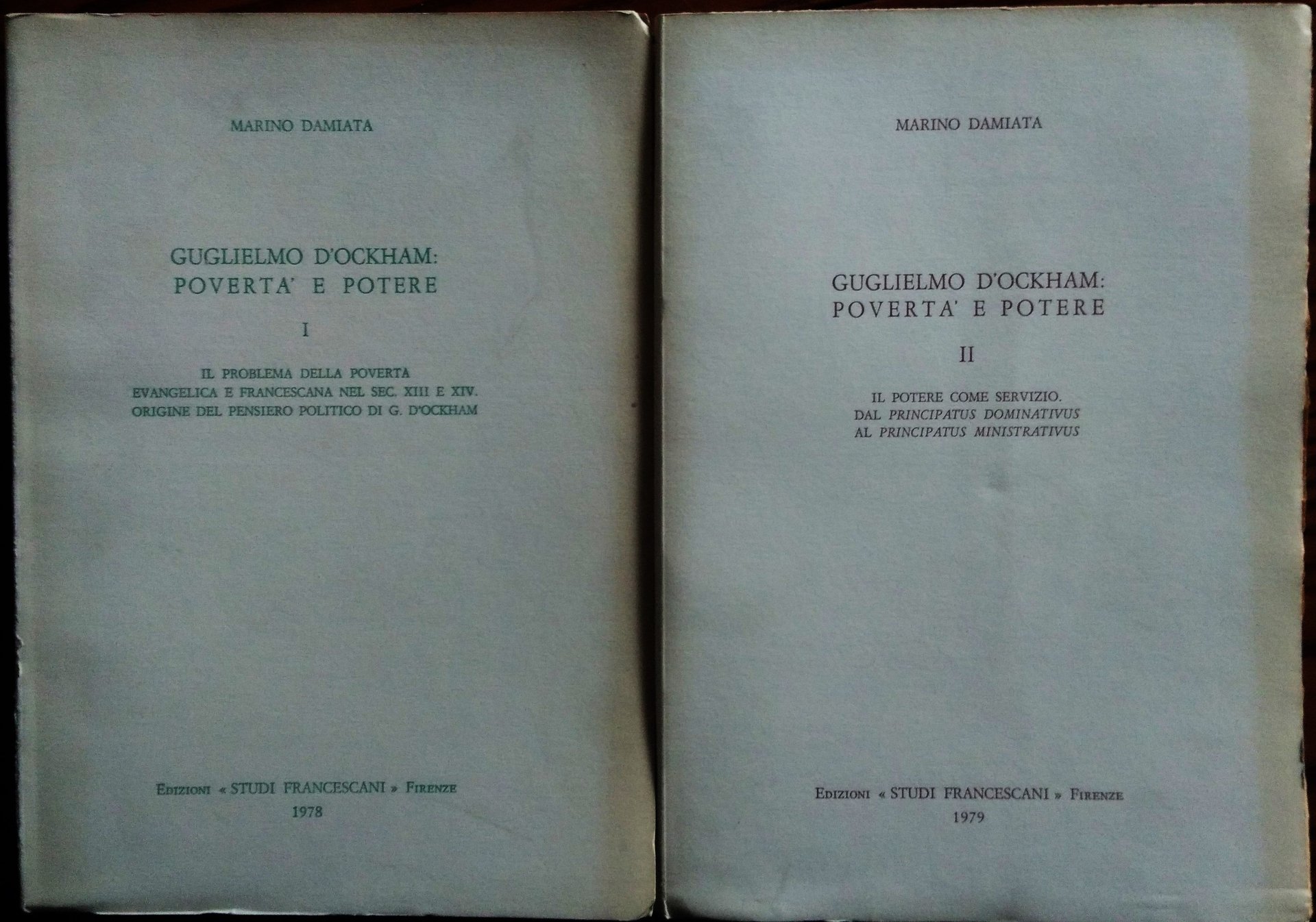 Firenze, Edizioni "Studi Francescani", 1978-1979. 8°, due volumi, brossure editoriali. Vol.I - Il problema della povertà evangelica e francescana nel sec. XIII e XIV. Origine del pensiero politico di G.D'Ockham, pp. 616; Vol. II - Il potere come servizio. Dal Principatus dominativus al Principatus ministrativus, pp. 480. Strappetti al margine inferiore bianco delle ultime 2 carte del secondo volume, bella copia.