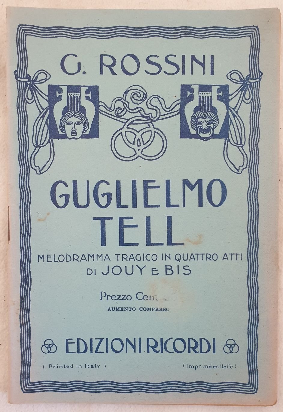 Bel libretto d'opera degli anni '40 dell'opera in quattro atti "Guglielmo Tell" di Gioachino Rossini (1792-1868) su libretto di Jouy e Bis dal dramma di Friedrich Schiller. Traduzione italiana di Calisto Bassi. La prima rappresentazione ebbe luogo all'Opera di Parigi il 3 Agosto 1829, la prima italiana a Lucca il 17 settembre 1831. In buone condizioni. Brossura editoriale in buone condizioni generali con lievi usure ai margini e dorso. Legatura in buone condizioni. All'interno le pagine si presentano in ottime condizioni con rare fioriture. In 16. Dim. 18x12 cm. Pp. 32. Beautiful booklet of the work in four acts "Guglielmo Tell" by Gioachino Rossini (1792-1868) on booklet by Jouy e Bis. Italian translation by Calisto Bassi.<BR>The first representation took place in the Opera in Paris the 3rd of august 1829, the first italian representation in Lucca the 17th of september 1831. In good conditions. Editorial cover in good general conditions slightly worn in the edges and spine. Binding in good conditions. Inside pages are in very good conditions with occasional foxings. In 16. Dim. 18x12 cm. Pp. 32. <BR><BR>