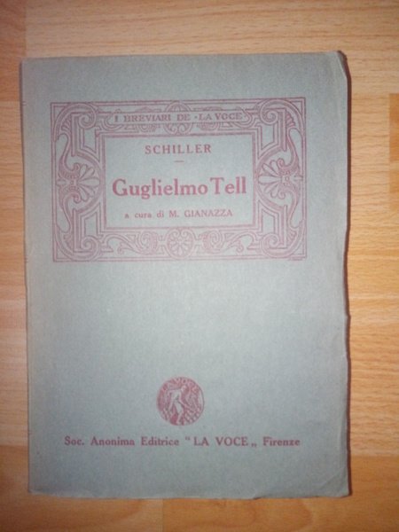 [Teatro- Guglielmo Tell]Brossura editoriale in cartoncino azzurro, titolo entro cornice rossa. -pp-55+21 con il catalogo Soc Anonima editrice la voce per gli anni 1924 1925 stampato su carta grave+ pubblicit‡ di altra collana editriale stampata su carta leggera azzurra. esemplare in barbe, ultimi due fogli chiusi, minime sottolinature a matita su qualche parola. All'interno alcune pagine di quaderno scritte a mano da probabile precedente lettore, in chiara e minuta grafia.[n54]