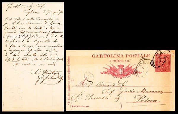 intero postale manoscritto e firmato di Guglielmo Volpi spedito a Guido Mazzoni datato Cagliari, 2 Giugno 1893; ottimo es.