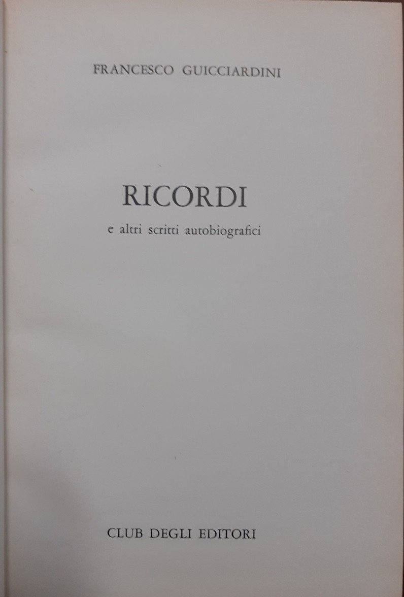 Francesco Guicciardini, Ricordi e altri scritti autobiografici, Club degli Editori, Milano 1975, pp. 285, cm 23, legatura in similpelle ed. con titoli e fregi in oro al dorso e fregi in oro al piatto. Collana I classici del Club degli Editori. Edizione a cura di Guido Davico Bonino. Indice: Prefazione – Ricordi – Appendice ai Ricordi – Dal Dialogo del reggimento di Firenze – Memorie di famiglia – Ricordanze – Francesco Guicciardini a se stesso – Consolatoria. All’interno del volume, conservata presentazione dello stesso a firma di Guido Davico Bonino (estratto dalla rivista del Club degli Editori, s.d., p. 10). Carta di guardia posteriore tagliata lungo margine tratteggiato poiché riportante il modulo d’ordine per il Club degli Editori, minime abrasioni al piatto anteriore, lievissima brunitura della carta, per il resto ottimo.