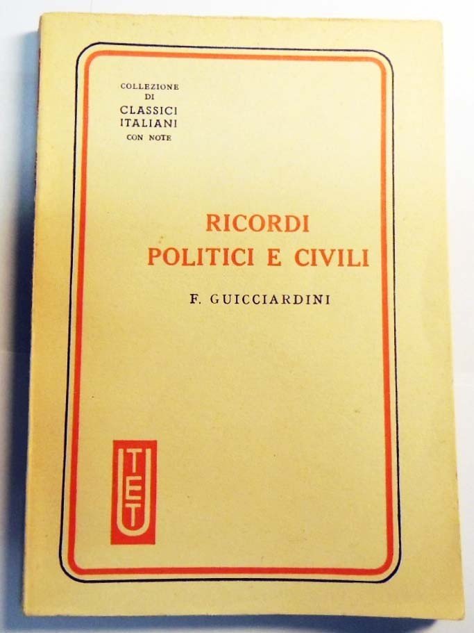 Francesco Guicciardini, Ricordi politici e civili, a cura di Adolfo Faggi, Unione tipografico-editrice torinese, Torino 1945, pp. XXI, 121, cm 17, br. ed. Collana Collezione di classici italiani con note, n. 56. Perfetto.