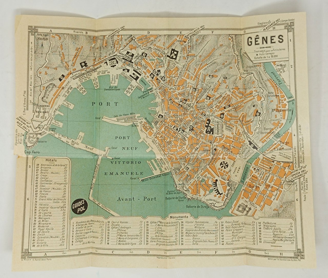Non datata ma, sicuramente, risalente alla seconda metà degli anni '20. Formato: 12 x 17 cm circa. Pagine: 40 più una grande carta geografica a colori (di dimensioni: 62,5 x 42,5 cm circa) più volte ripiegata su se stessa e fissata sul retro della copertina posteriore. Titolo della carta 'Nuova pianta topografica di Genova dal Capo di Faro (Lanterna) al Lido di Albaro'. Su di essa sono rappresentate anche le linee tramviarie e ferroviarie. Stato di conservazione: decisamente buono (si segnalano esclusivamente due o tre minuscoli taglietti in corrispondenza degli incroci delle linee di piegatura della carta). Brossura editoriale con copertina cartonata flessibile con titoli, cornice decorativa e fregio in bicromia sul piatto anetriore. Si aggiunge una carta geografica a colori, di Genova, di dimensioni: 29,5 x 25,5 cm circa, anch'essa conservata più volte piegata su se stessa, in scala 1:15.000, tratta dala guida francese 'Guides Pol'.