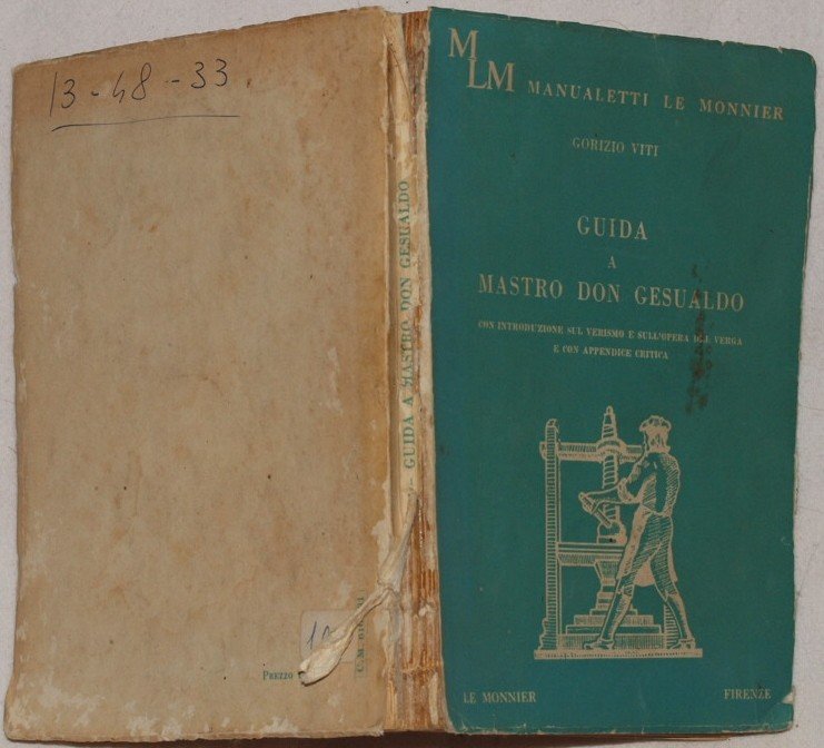 In 16. Dim. 17x12,5 cm. Pp. 162+(6). Interessante volume del 1967, un saggio di Gorizio Viti sull'opera "Mastro Don Gesualdo" di Giovanni Verga. Tra gli argomenti trattati all'interno: il verismo e Verga, Mastro Don Gesualdo, "Mastro Don Gesualdo" e la critica ecc. Sottolineature e note manoscritte all'interno. In discrete condizioni. Copertina editoriale in discrete condizioni generali con usure e parti mancanti ai margini e dorso, mende. Piatto anteriore in parte staccato. Legatura in discrete condizioni con rotture. All'interno le pagine si presentano in discrete condizioni con rare fioriture e lievi gore d'umidità. Interesting volume of 1967, an essay of Gorizio Viti about the work "Mastro Don Gesualdo" by Giovanni Verga. Between the issues treated inside: verism and Verga, Mastro Don Gesualdo, "Mastro Don Gesualdo" and critic etc. Underlinings and amnuscripted notes inside. In fair conditions. Editorial cover in fair general conditions with wearings and missing parts in the edges and spine, usage signs. Front plate partially detached. Binding in fair conditions with cracks. Inside pages are in fair conditions with occasional foxings and slight humidity stains.