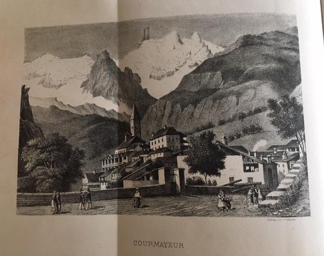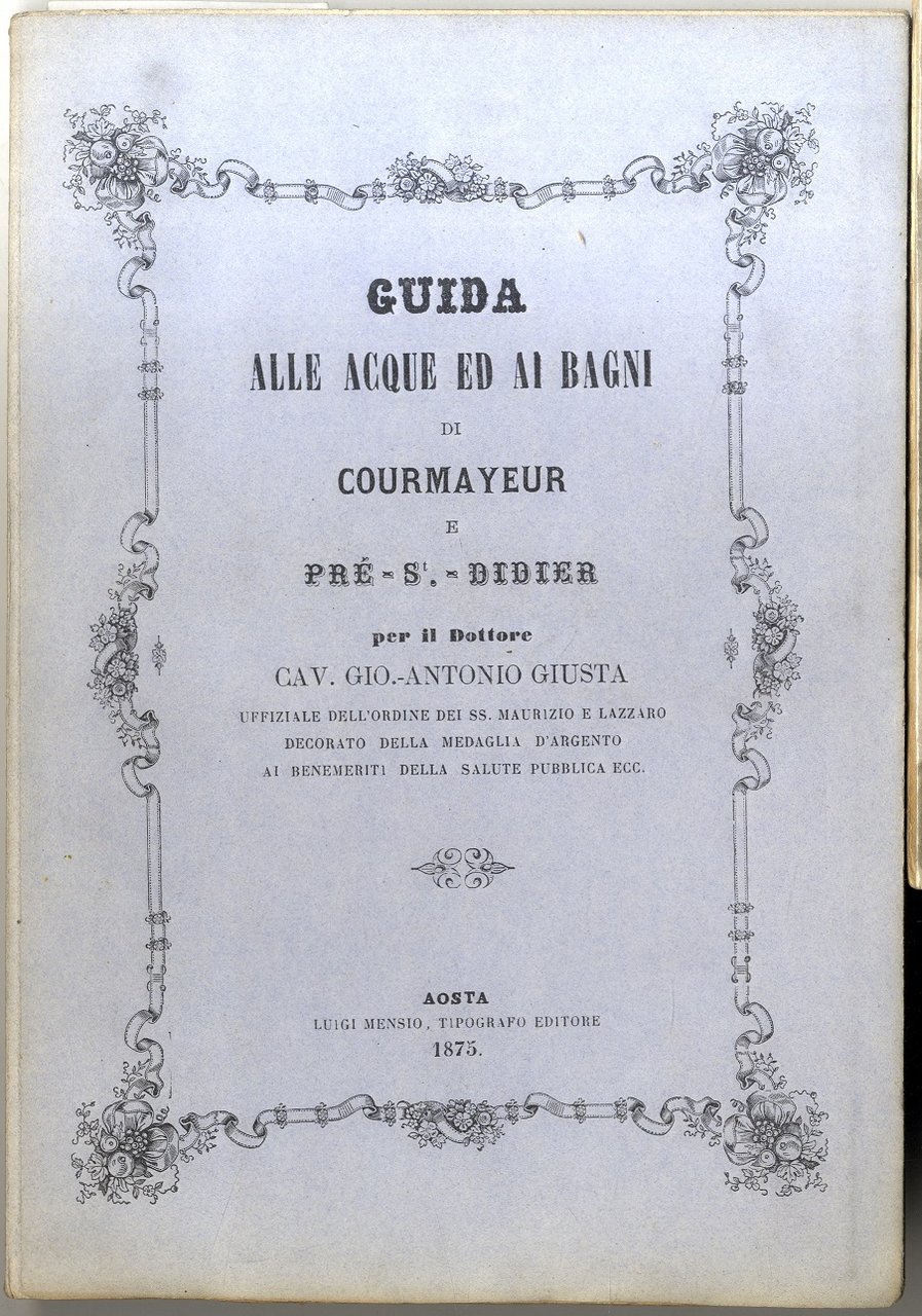 >in-16, pp. 150, broch. edit., intonso. Con 2 finissime tavole litogr. dei fratelli Doyen ripieg. f.t. (belle vedute di Courmayeur col Monte Bianco sullo sfondo e i ''bains neufs'' di Pré-Saint-Didier). Prima ed unica edizione di ''questo lavoro di Giusta che oltre a descrivere la storia e i benefici delle terme delle due località, le escursioni, le passeggiate, contiene anche notazioni turistiche e pubblica, nelle ultime pagine, il Regolamento delle Guide di Courmayeur, approvato nel 1868, con la tariffa delle corse'' (Réan p. 173). Conservazione perfetta. Perret 1950. Manno V, 18682. Peyrot, Valle d'Aosta I, 347.