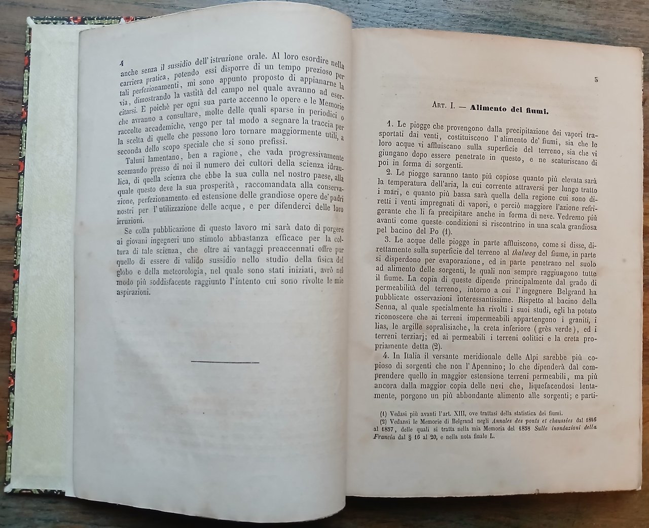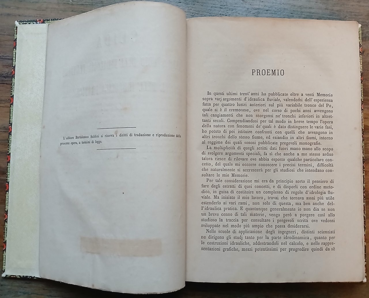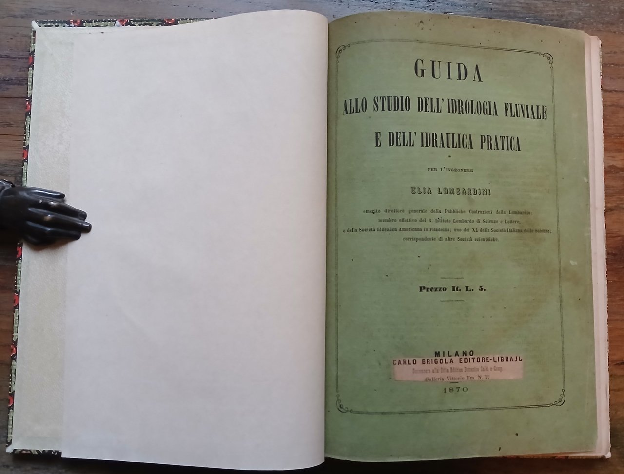 (Ingegneria; Idraulica; Idrologia; Idrotecnica) In 8°, legatura moderna in mezza tela verde, tassello in pelle rossa con titoli in oro al dorso, carta decorata ai piatti, conservati i piatti della brossura editoriale, pp. 218,(2). Una pecetta in carta a stampa ("Carlo Brigola Editore Librajo") applicata sulla brossura e sul frontespizio in corrispondenza dell'indicazione dell'editore. Edizione originale. Esemplare solido ed in ottimo stato di conservazione.