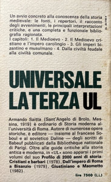 Soggetti: Storia medievale, Medievistica, Critica, Guide, Manuali, Storiografia, Interpretazioni storiografiche, Medioevo, Bibliografia, Riferimento, Studi culturali, Mentalità, Letture, Letteratura, Classici, Analisi storica, Eventi, Cronologia, Imperi, Sacro Romano Impero, Unità, Cristianesimo, Religione, Chiesa, Potere temporale, Potere spirituale, Papato, Papa, Ordini monastici, Movimenti religiosi, Islam, Crociate, Terra Santa, Guerre, Battaglie, Conquiste, Francia, Italia, Età comunale, Comuni, Principati, Signorie, Economia Feudalesimo, Proprietari terrieri, Aristocrazia, Nobiltà, Reali, Monarchia assoluta, Assolutismo, Re, Spagna, Belgio, Olanda, Germania, Principi, Turchia, Impero Ottomano, Bisanzio, Costantinopoli, Israele, Palestina, Medio Oriente, Privilegi, Contadini, Campagne, Città, Urbanesimo, Demografia, Epidemie, Malattie, Peste, Spezie, Mercati, Commercio, Asia, Marco Polo, Cina, India, Inghilterra, Lotta per le investiture, Roma, Toscana, Impero carolingio, Documenti, Fonti storiche, Federico Chabod, Le Goff, Idea, Concetti, Ducati, Granducato, Lucca, 476-1492, Edad Media, Fuentes, Mommsen, Secoli bui, Superstizione, Odoacre, Cristianità, Impero bizantino, Maometto, Henri Pirenne, Anno Mille, Kiev, Arabi, Russia, Slavi, Bisanzio, Macedonia, Abbasidi, Isaurici, Diarchia medievale, Periodizzazione, Repubbliche marinare, Genova, Pisa, Amalfi, Mar Mediterraneo, Templari, Selgiuchidi, Bernardo da Chiaravalle, Benedettini, Riccardo Cuor di Leone, Venezia, Dogi, Enrico Dandolo, Santo Sepolcro, Federico Barbarossa, Università, Cipro, Saladino, Guiscardo, Ostrogorsky, Imbarbarimento, Invasioni barbariche, Persia, Diplomazia, Franchi, Goti, Vandali, Poitiers, De Maistre, Novalis, Carlo Magno, Trecento, Duecento, Longobardi, Vescovi, Clero, Monasteri, Cavalieri, Tommaso d'Aquino, Giotto, Arte romanica, Gotico, Pittura, Iconografia, Dante Alighieri, Divina Commedia, Chaucer, Cattedrali, Incastellamento, Banno, Fortificazioni, Mura, Difesa, Esercito, Società signorile, Crisi, Ugo Capeto, Normanni, Regno di Sicilia, Castiglia, Aragona, Reconquista, Filippo Augusto, Federico II, Balcani, Baldovino, Urbano II, Lettere di cambio, Scisma, Avignone, Guerra dei cent'anni, Guerra delle due rose, Isabella la Cattolica, Lancaster, Casate, Calais, York, Filippo IV, Giovanna d'Arco, Pace di Arras, Georges Duby, Marc Bloch, Franco Cardini, Jacques Le Goff, Philippe Contamine, Monaci di Cluny, Inquisizione, Caccia alle streghe, Compagnia di ventura, Napoli, Suffeudo di Lauria, Regesto, Serbia, Libri Vintage Fuori catalogo, Saggistica, Collezionismo, Medieval history, Medieval, Criticism, Guides, Manuals, Historiography, Historiographic interpretations, Middle Ages, Bibliography, Reference, Cultural studies, Mentality, Readings, Literature, Classics, Historical analysis, Events, Chronology, Empires, Holy Roman Empire, Unity, Christianity, Religion, Church, Temporal power, Spiritual power, Papacy, Pope, Monastic orders, Religious movements, Crusades, Holy Land, Wars, Battles, Conquests, France, Italy, Communal age, Commons, Principalities, Lordships, Economy Feudalism, Landowners, Aristocracy, Nobility, Royalty, Absolute monarchy, Absolutism, Kings, Spain, Belgium, Holland, Germany, Princes, Turkey, Ottoman empire, Byzantium, Constantinople, Israel, Palestine, Middle East, Privileges, Peasants, Campaigns, Cities, Urbanism, Demography , Epidemics, Diseases, Plague, Spices, Markets, Commerce, China, England, Investiture struggle, Rome, Tuscany, Carolingian empire, Documents, Historical sources, Concepts, Grand Ukrainian, Dark centuries, Superstition, Odoacer, Christianity, Byzantine empire, Muhammad, Year 1000, Arabs, Slavs, Byzantium, Macedonia, Abbasids, Isaurians, Medieval diarchy, Periodization, Maritime republics, Mediterranean sea, Templars, Seljuks, Clairvaux, Benedictines, Richard the Lionheart, Venice, Doges, Holy Sepulcher, University, Cyprus, Saladin, Guiscard, Barbarianism, Barbarian invasions, Diplomacy, Franks, Goths, Vandals, Charlemagne, Lombards, Bishops, Clergy, Monasteries, Knights, Romanesque art, Gothic, Painting, Iconography, Divine Comedy, Chaucer, Cathedrals, Enclosure, Fortifications, Walls, Defense, Army, Stately society, Crisis, Kingdom of Sicily, Castile, Aragon, Reconquista, Philip Augustus, Frederick II, Balkans, Baldwin, Urban II, Letters of exchange, Schism, Avignon, Hundred Years' War, War of the Roses, Isabella the Catholic, Philippe IV, Joan of Arc, Peace, Monks, Inquisition, Witch hunt, Company of fortune, Naples, Register, Out of print books, Non-fiction, Collectibles