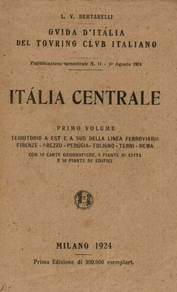 Guida dell'Italia Centrale, primo volume: territorio a Est e a Sud della linea ferroviaria, Firenze-Arezzo-Perugia-Fligno-Terni-Roma; con 19 carte geografiche, 8 piante di città e 10 piante di edifici.Br.ed., ill., in 16mo, lievi segnature e bruniture ai margini, copertina leggermente strappata sul retro, segnalibri in stoffa.