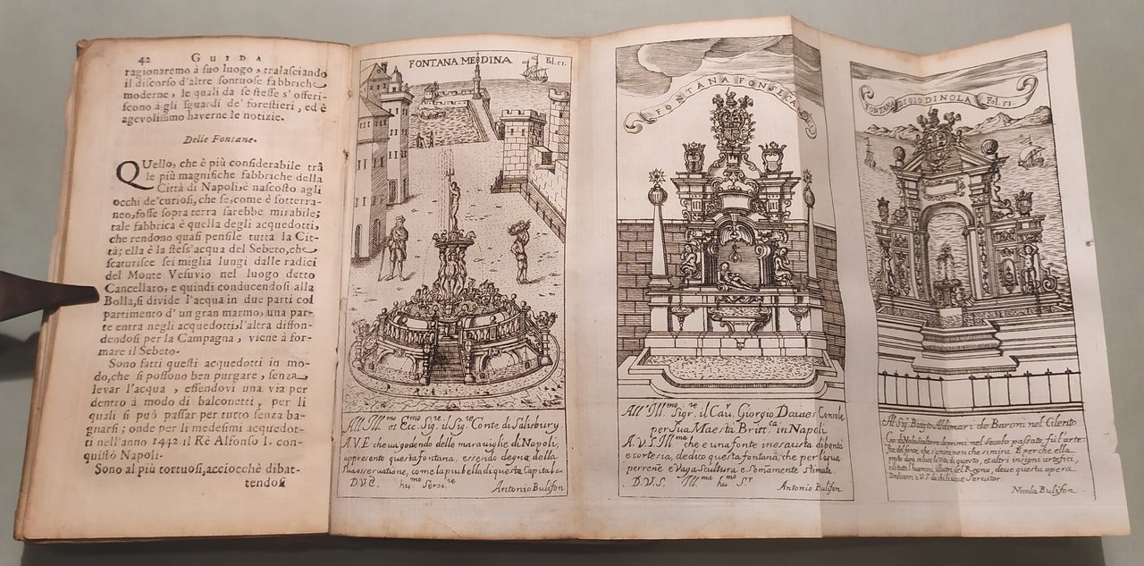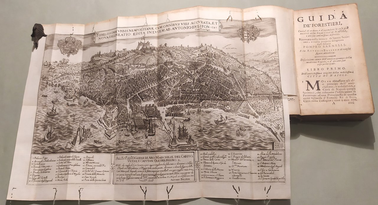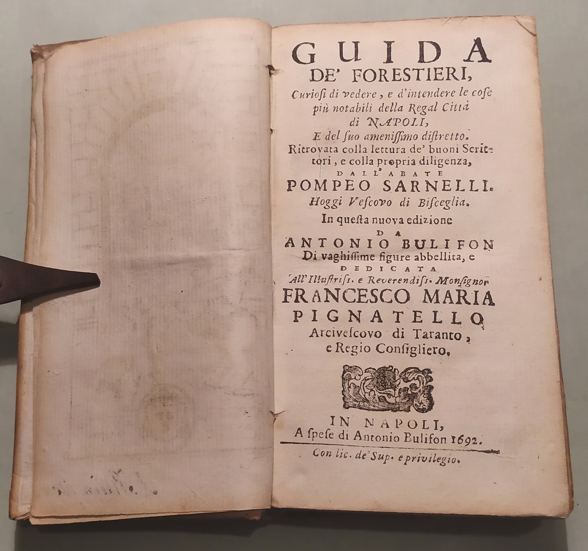 Napoli, a spese di Antonio Bulifon, 1692. In 16mo; cc.17n.nn., pp.401, 29n.nn. Antiporta e 54 tavole incise in rame. Grande tavola spieghevole con la veduta della città di Napoli a volo d’uccello: sui margini bianchi lievi fori da tarlo (vedi foto). Pergamena coeva. Pironti, Editori francesi in Napoli, pag.119; British Library, Cat. of 17th Century Italian Books II, pag.825.