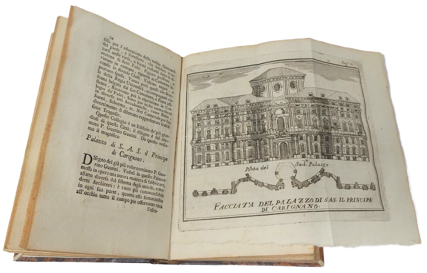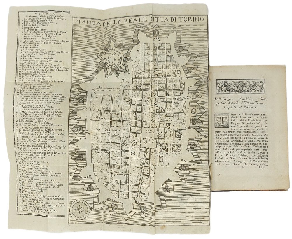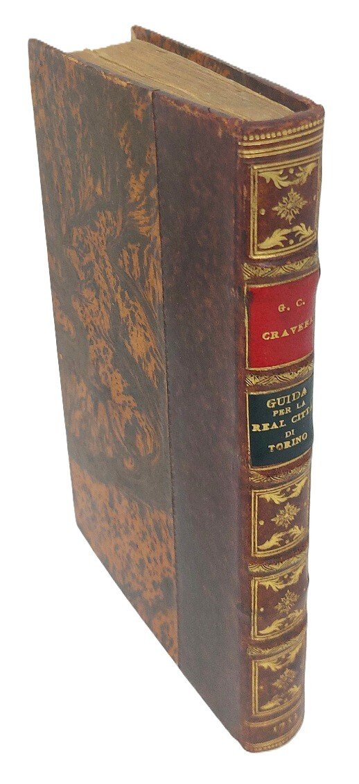 >in-8 (187 x 112mm), pp. (6), 191, (1); (ma il quaderno F è di 9 fogli: la numerazione 95-96 è ripetuta); vignetta xilografica al frontespizio, 9 tavole incise in rame e ripiegate inclusa una mappa della città di Torino. Legatura posteriore in mezza pelle bazzana, titolo in oro su duplice tassello rosso e verde, ricchi fregi oro al dorso. Prima edizione e prima tiratura della prima guida stampata della città di Torino, rarissima. Nel medesimo anno uscì anche una tiratura con 7 tavole (senza il Collegio dei Nobili e il Palazzo del Seminario) che presenta alcune lievi difformità testuali. La Guida fu data alle stampe alla vigilia delle grandiose celebrazioni del terzo Anno secolare del Miracolo del SS. Sacramento del 1753. «Ho pensato io di accingermi a dare questa soddisfazione al pubblico non già con una storia compita, che tratti diffusamente delle sue Antichità, e Fatti più egregj, perché di ciò ne trattarono già altri Autori: ma con pubblicare un Compendio dello Stato presente, tantoché basti per informarne sufficientemente i Forestieri». Ottimo esemplare, a grandi margini e molto fresco (mappa con strappetto riparato, qualche altro sporadico strappetto, alcune bruniture e fioriture), timbro di appartenenza sbiadito al frontespizio (M. Grand...) Peyrot, Torino nei secoli, n.181. Cicognata 4345. Schlosser 552.
