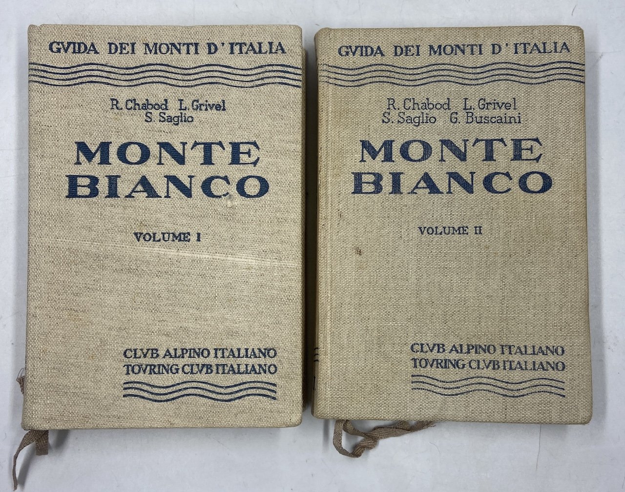 Due volumi in tela, cm 16x11. Volume I (1963) di Chabod, Grivel e Saglio, pp 492 (2); 59 schizzi di Chabod, 16 foto a colori di Saglio, carta a colori ripiegata in tasca. Volume II (1968) i tre autori del precedente con Buscaini, pp 492 (2); 61 schizzi in nero di Chabod e Buscaini, XVI vedute pittoriche a colori di Chabod, carta a colori ripiegata in tasca. Prima edizione, pubblicata nel Primo Centenario del Club Alpino Italiano, di questa importante e attesa guida alpinistica e sciistica del maggiore massiccio delle Alpi. L’opera fu dapprima curata da Renato Chabod, Lorenzo Grivel e Silvio Saglio, “tre anziani” cui si aggiunse per il secondo volume Gino Buscaini, dopo la morte di Saglio; gli autori si avvalsero di una lista di collaboratori d’eccezione: Carlo Passerin d’Entrèves per le note di storia e folklore e Ercole Martina per quelle di geologia, poi Walter Bonatti, Franco Garda, Toni Gobbi, Piero Nava, Albin ed Edouard Pennard, Massimo Mila, Livia Bertolini Magni, Aimé Chenal e molti altri. La guida, inizialmente progettata in tre volumi, si fermò al secondo, tralasciando i gruppi interamente estranei ai confini nazionali quali le Aiguilles de Chamonix e l’Aiguille Verte; la prima parte della guida espone notizie oro-geologiche, storiche e su vie d’accesso e rifugi, seguono la corposa trattazione alpinistica (Volume I: Géant-Rochefort, Jorasses, Leschaux-Talèfre, Triolet-Dolent; Volume II: Glaciers - Trélatête, Milage - Bionnassay - Goûter, Monte Bianco, Brouillard - Innominata, resta di Peutérey, Maudit - Tour Ronde, Mont Blanc du Tacul) e le note sciistiche in fine.