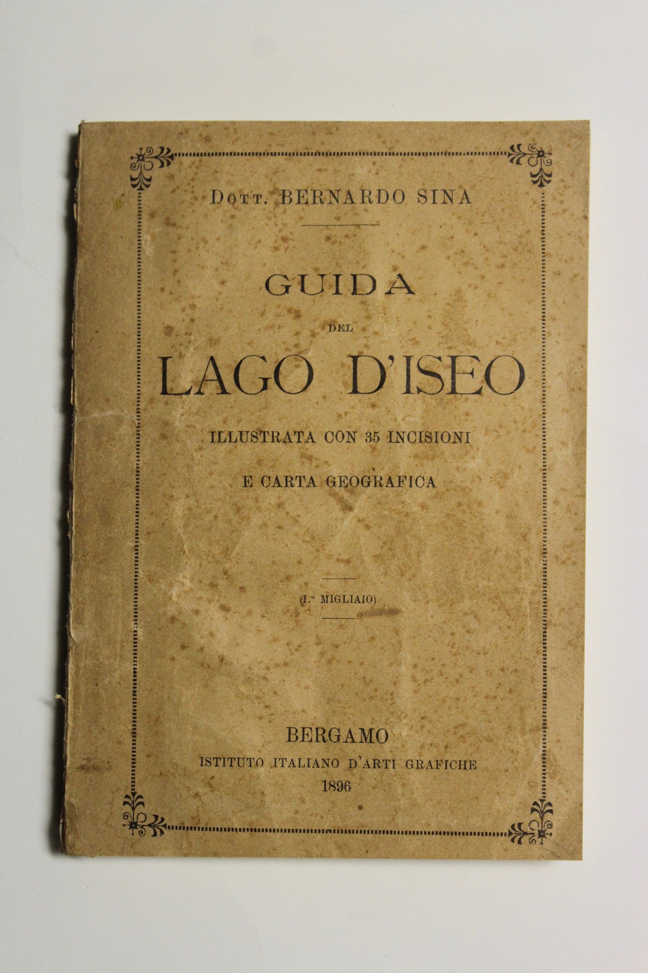 In 16° (mm 160x110). Pagg. 94 (pagg. 12, di pubblicità), con cartina geografica ripiegata f.t. che riporta la strada ferrata da Bergamo a Brescia in basso. All'inizio due pagg. di carattere pubblicitario della Società Loverese di navigazione a vapore sul Lago d'Iseo. 35 illustrazioni con vedute di località lacustri ricavate da fotografie eseguite dall'autore. Brossura editoriale coeva a stampa. Buon esemplare con qualche menda, strappetti restaurati alla mappa, non molto solida la legatura. <BR>