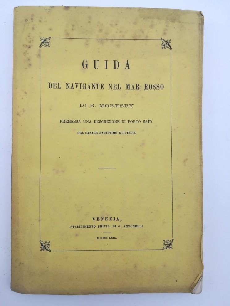 In 8 (cm 15 x 22), pp. 267 + (1 bianca) con 2 tavole fuori testo piu' volte ripiegate. Pagine intonse. Brossura editoriale con qualche brunitura ai piatti, ma ottima copia nel complesso. Traduzione italiana dall'originale inglese "Sailing Directions for the Red Sea" pubblicato nel 1841. Il testo fu tradotto su proposta di Luigi Torelli, Senatore del Regno e membro dell'Istituto veneto di scienze, lettere ed arti che bandi' nel 1856 un concorso a premi in occasione dell'apertura del progetto di costruzione del Canale di Suez (realizzato poi nel 1869, anno di uscita del volume). Prima di allora - si dice nella prefazione - mancava 'ogni guida nautica del Mar Rosso nella nostra lingua'. La traduzione venne curata da Francesco Lambertenghi, viceconsole del consolato di Suez, e da Fabio Mannati, luogotenente di vascello della Real Marina.