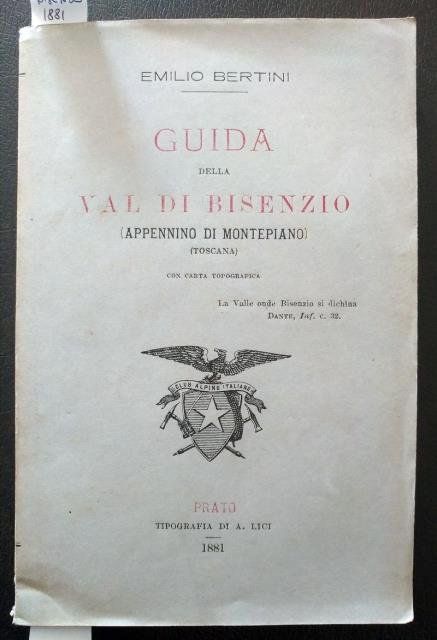 Tipografia di A. Lici, Prato, 1881. In 12esimo, pp. 219 (con Indici) + 1 cartina topografica in b/n rip. in fine (Carta della Val di Bisenzio) + 16 stampate su fine carta giallina con pubblicità editoriali e commerciali, bross. orig. edit. in carta grigia con stemma del C.A.I. La prima parte racchiude le note storico - descrittive, la seconda gli itinerari all'interno della Val Bisenzio. Emilio Bertini (Prato, 22 febbraio 1836 – 6 agosto 1886), noto anche come Emilio Giuseppe Alemanno Bertini, insegnante e alpinista italiano. Rara prima edizione. Conservazione molto buona.