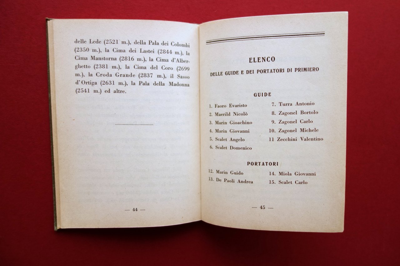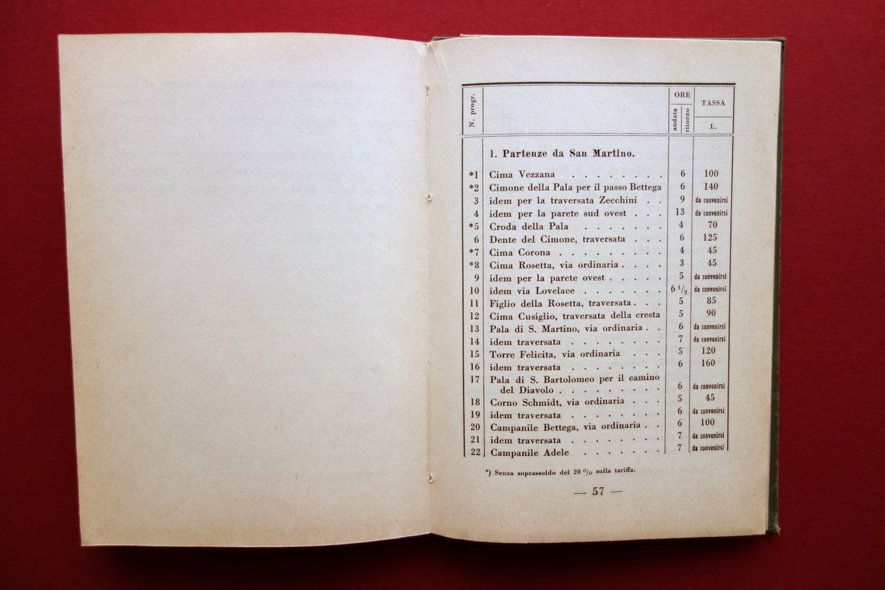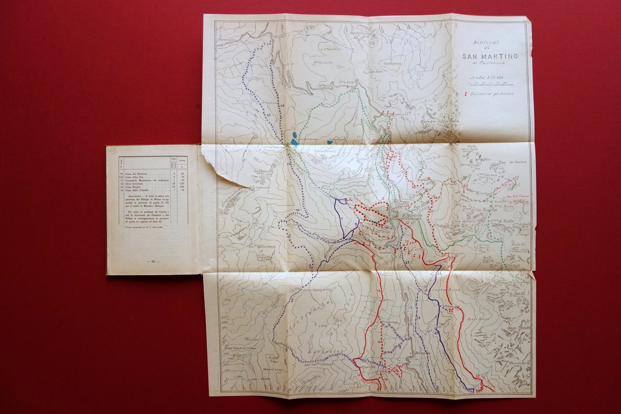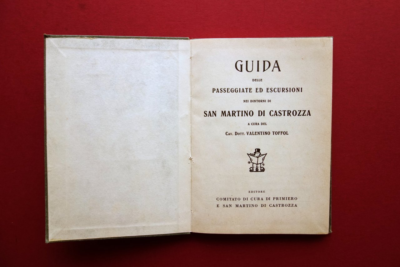 Guida, Guida delle passeggiate ed escursioni nei dintorni di San Martino di Castrozza a cura del Cav. Dott. Valentino Toffol Comitato di Cura di Primiero e San Martino di Castrozza, s. d. (primo Novecento); cm 15x11; pp.62 pi√π una carta con dettagli a colori dei percorsi rip. pi√π volte al termine del testo; tutta tela ed. con titolo al piatto ant. Condizioni di conservazione Esemplare in buone condizioni con tracce d'uso; coperta con qualche piccola leggera macchietta. Interni buoni; poche pagine con una piccola croce a matita al margine; carta rip. pi√π volte con strappetto di alcuni cm al margine interno, una piccola pieghetta all'angolo superiore destro (vedi foto). Raro, corredato della carta fuori testo (vedi foto). OPEB.4927 N