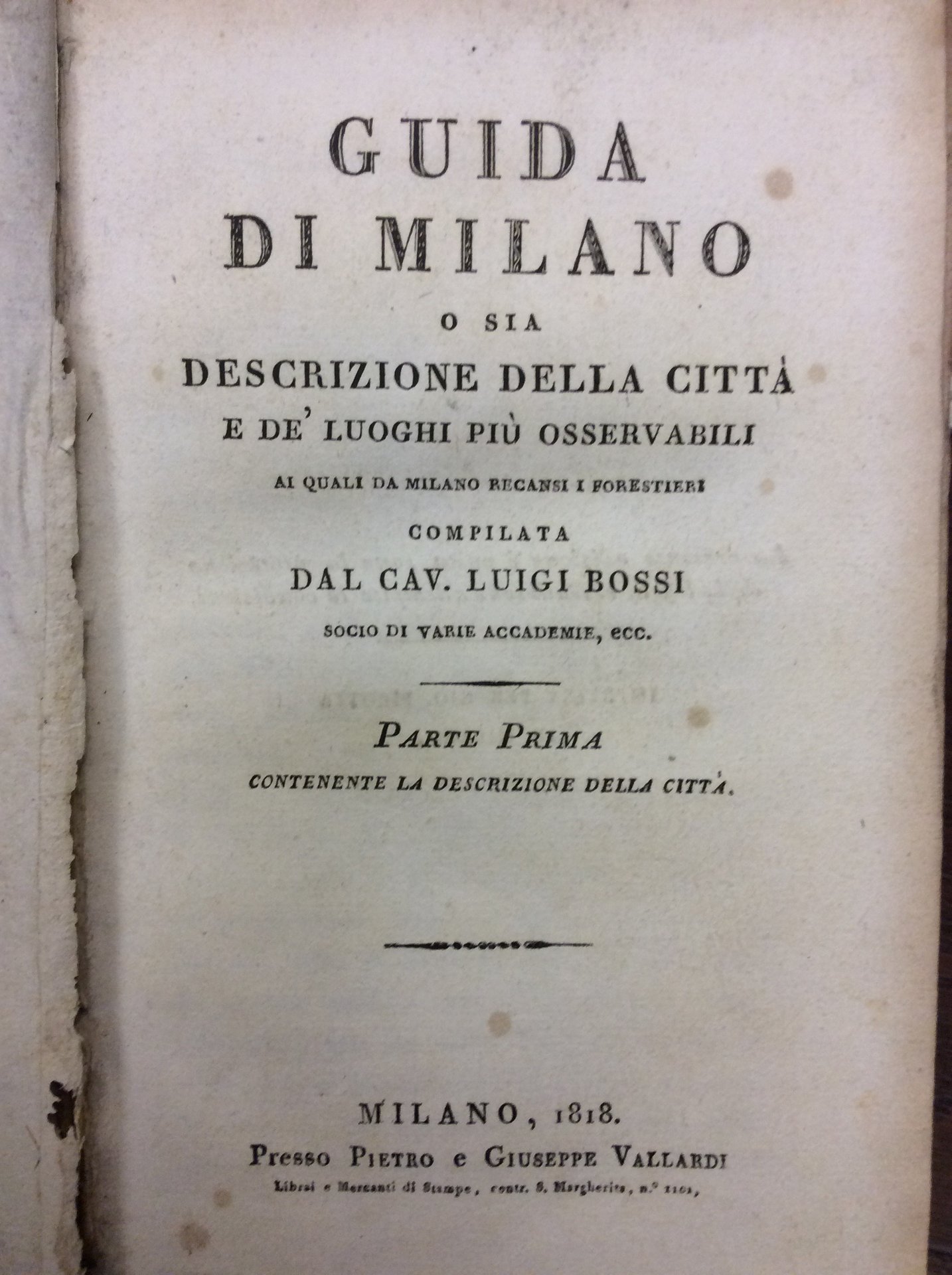 In-16 gr. (mm. 189x120), 2 volumi, brossura editoriale (con abrasioni e mancanze ai dorsi), pp. (12),299; 284; ciascun vol. con tre indici assai pratici e interessanti. Il primo volume contiene la descrizione della città; il secondo la descrizione de luoghi più osservabili ai quali da Milano recansi i forestieri. "Edizione originale". Cfr. Villa Bibliogr. Guide di Milano,135: Nell'avviso al lettore, il Bossi ricorda le descrizioni di Milano più note. Dato l'aspetto interamente cambiato per vicende politiche, mutamenti e soppressioni, i fratelli Vallardi vollero riprendere l'ottima guida del Bianconi, annotando tutti i cambiamenti ed emendando gli errori. L'ordine del Bianconi viene mantenuto ma si omettono, nei titoli dei diversi paragrafi, quelle Chiese o stabilimenti che oramai non esistono più. Quella del Bossi è, senza alcun dubbio, la miglior guida di Milano dell'Ottocento.Inoltre, nellAvviso al lettore, leditore dice ove gli acquirenti lo desiderino, la guida sarà adornata da una pianta della città, una carta del viaggio ai tre laghi e da alcune tavole incise in rame, ma poi ciò non avvenne a causa della lentezza di un artista, come si legge nella Gazzetta di Milano del 7 gennaio 1819. Lievi aloni marginali su entrambi i volumi; fioriture intercalate nel testo, altrimenti buon esemplare, con barbe.