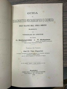 Elaborata per veterinarii ed agronomi. Versione dal Tedesco del D. Ugo Caparini. Napoli. Jovene 1880, 8°, pp. 190, con figure incise nel testo. Leg. Mz pelle, tit. in oro al dorso con spellature.