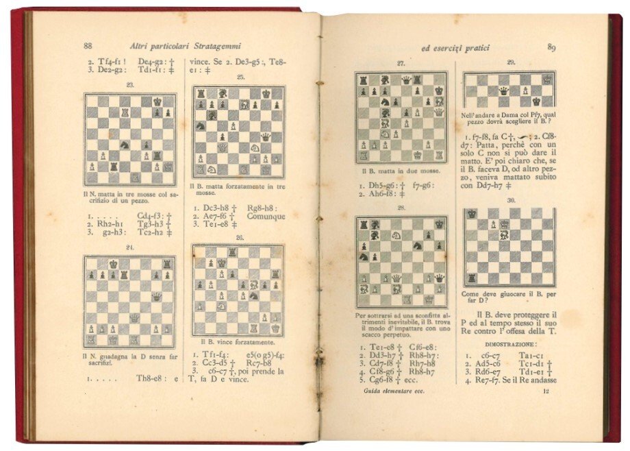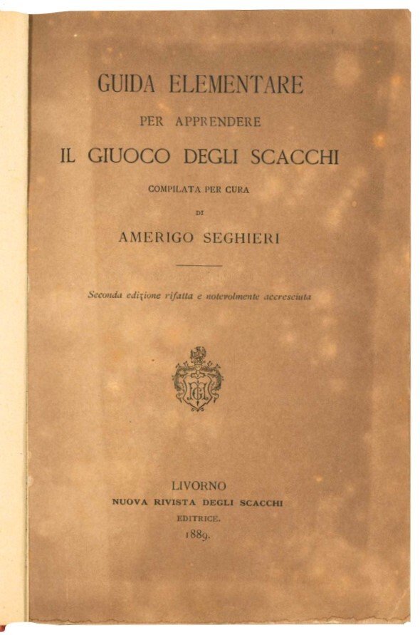 Mm. 182x117. Pp. VIII, 352. Con numerose figure di tecniche e mosse del gioco degli scacchi. Alcune cc. risultano brunite. Rilegato editoriale rosso con titolo inciso in oro al dorso (lievemente sciolto dalla rilegatura). Seconda edizione rifatta e notevolmente accresciuta.