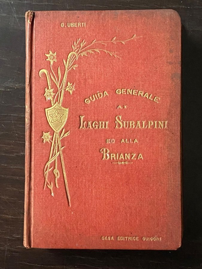 In-16° (cm. 16), legatura editoriale in tutta tela rossa con titolo in oro al dorso (brunito e internamente disgiunto) e al piatto anteriore con una graziosa illustrazione impressa sempre in oro (lievi tracce d'uso), tagli marmorizzati; pp. 526 [18 di pubblicità] in stato molto buono (lieve brunitura uniforme, sporadiche fioriture); con 15 belle illustrazioni di vedute nel testo, di cui 1 all'antiporta, e 1 grande carta geografica più volte ripiegata fuori testo in fine. Bella e non comune edizione di questa guida «con gite ai laghi minori, alla Valsassina, al Canton Ticino, alla Brianza, al Varesotto e indicazioni di escursioni alpine». Interessante appendice sulla Valtellina. Buon esemplare. (NQ9)