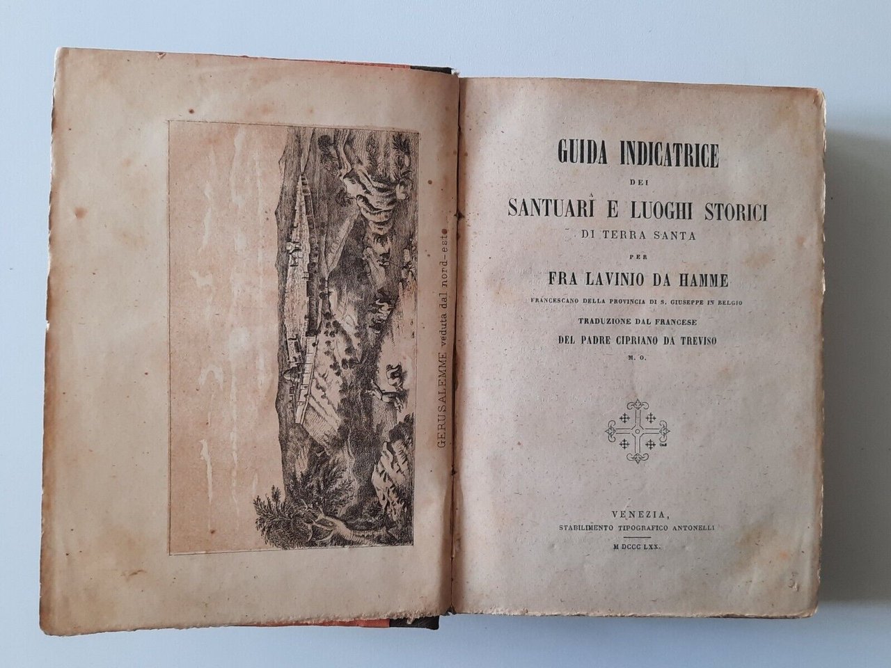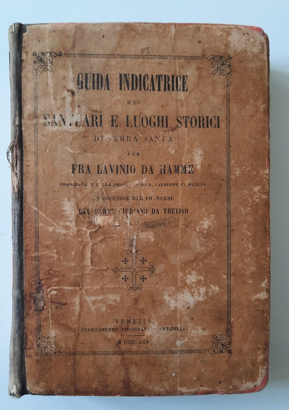GUIDA INDICATRICE DEI SANTUARI E LUOGHI STORICI TERRA SANTA PER FRA LAVINIO HAMME TIP. ANTONELLI 1870In 16°, pag. 752, legatura telata con dorso e piatto applicati, 7 tavole di cui una ripiegata.Lievi segni alla copertina.