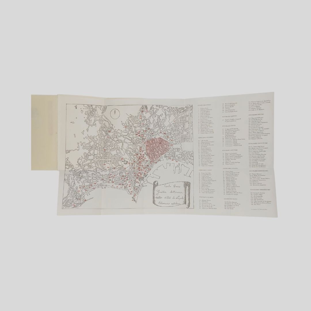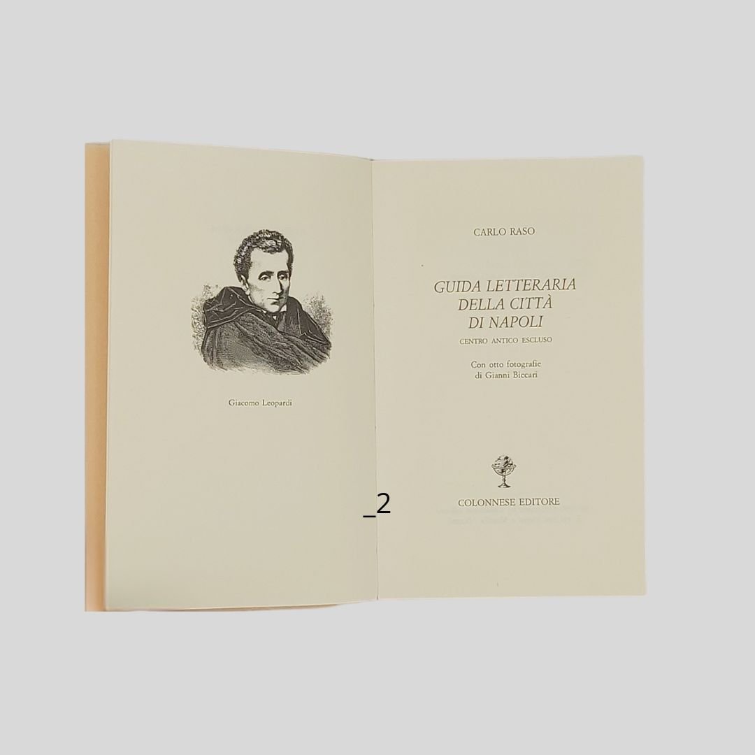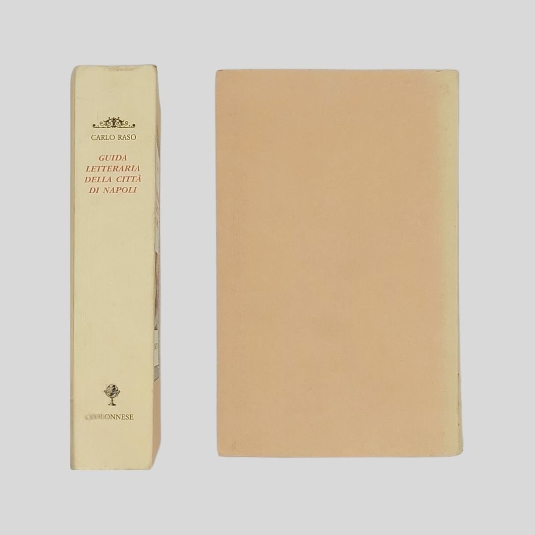 In-24° (cm 14,5), pp. 417-(7). Con 8 fotogr. in b.n. di Gianni Biccari, f.t. Tredici itinerari letterari con piantina ripiegata. Collana Lo Specchio di Silvia, 31. Naturali “segni del tempo” alla copertina, ma in buone condizioni. La prima guida letteraria di Napoli – centro antico escluso – in tredici itinerari. «Con questa Guida letteraria della città di Napoli, Carlo Raso estende a tutto il territorio urbano quanto trattato per il solo centro antico. Così, l’idea originaria di un’unica passeggiata, concretizzatasi in dimensioni notevolmente più ampie nella Guida letteraria del centro antico di Napoli, si arricchisce ora di altri tredici itinerari, snodantisi da Piazza Plebiscito alla Riviera di Chiaia, da Posillipo al Vomero, da Via Toledo alla Marina… non senza sorprese per quartieri come Materdei e Stella, la Sanità e quelli Spagnoli». «Il tutto in una maggiore ariosità e solarità, che vede ad esempio protagonisti alcuni balconi: quello di Nuova Santa Maria Ognibene dal quale Giacomo Leopardi osservava l’eruzione vesuviana del 1834, l’altro di Via Formale con il giovane Francesco De Sanctis declamante le ottave della Gerusalemme Liberata, quello di Via Bausan, primo palcoscenico per Eduardo e Peppino De Filippo».