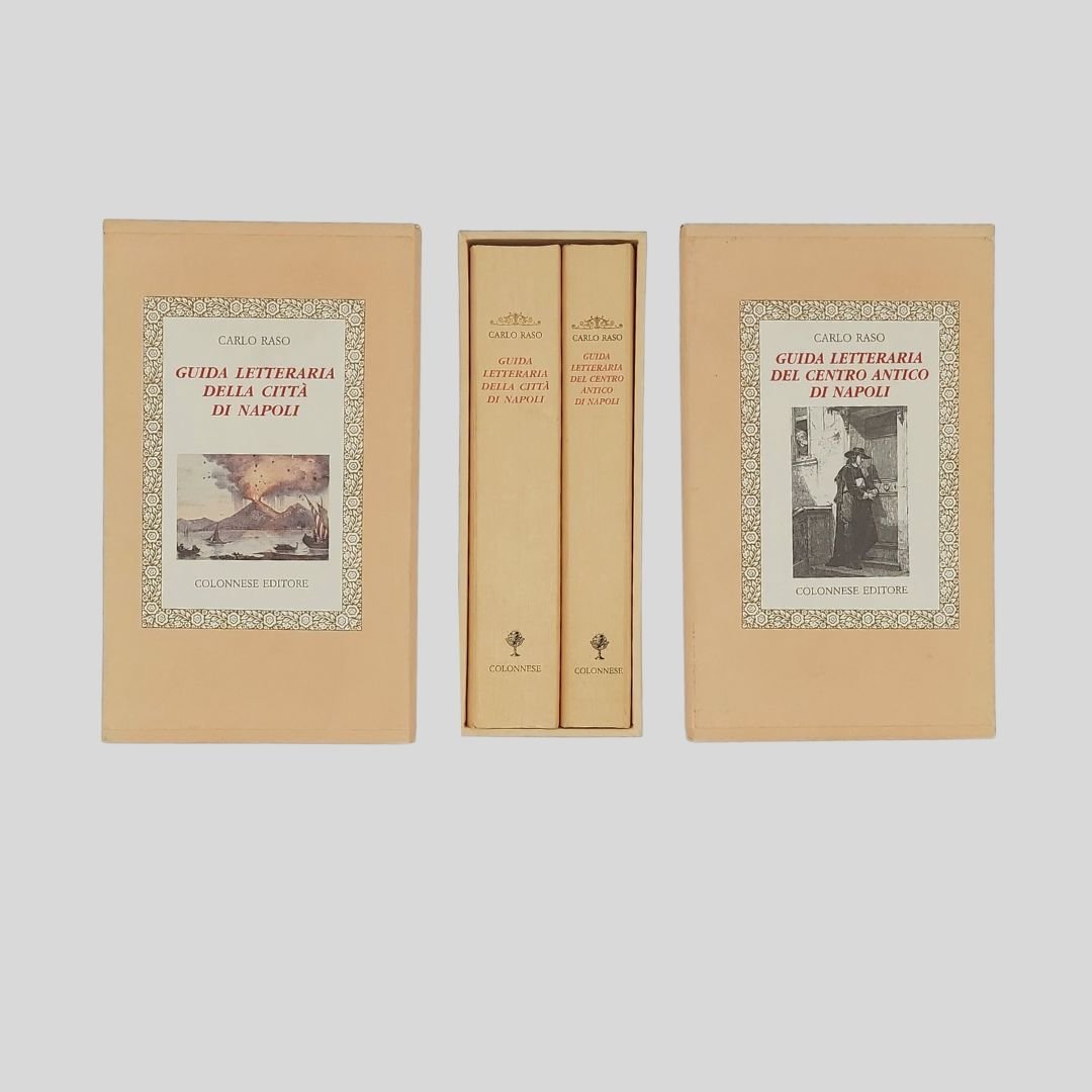 2 voll. in cofanetto. In-24° (cm 14,5), pp. 269 (3)-4 n.n. (catalogo), 419-(7)-4 n.n. (catalogo). Con 14 fotogr. in b.n. di Gianni Biccari, f.t. e 2 piantine ripiegate (centro antico e città di napoli). Complessivamente ventuno itinerari letterari. Collana Lo Specchio di Silvia. Naturali “segni del tempo” alla copertina, ma in buone condizioni. Seconda edizione.