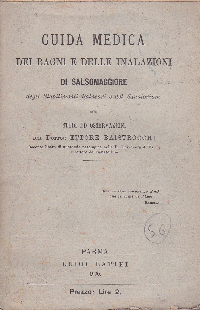 In16°, pp. (4), 258, brossura editoriale. Una carta geografica e 31 illustrazioni fotografiche f.t. in fine. Tabelle e planimetrie n.t. Dorso restaurato. Dedica autografa dell'autore (libero docente di anatomia patologica all'Università di Parma e direttore del Sanatorium di Salsomaggiore) a Giuseppe Mussi (Milano, 1836-Baveno, 1904), deputato e senatore per il Partito Radicale, Vicepresidente della Camera dal 1892 al 1894 e Sindaco di Milano dal 1899 al 1903. Cenni sulla storia di Salsomaggiore, l'estrazione del sale da cucina dai tempi remoti sino al 1839, la storia delle cure idroterapiche nel comune emiliano, la geologia, topografia e climatologia locali, le proprietà medicinali delle acque di Salsomaggiore nel curare varie patologie (scrofola, pellagra, sifilide, reumatismi, malattie dei genitali, deperimento, obesità, gotta, diabete, ecc.), dati statistici, bibliografia, ecc.