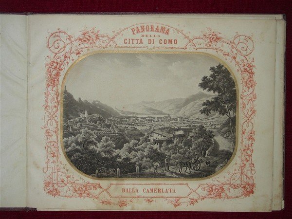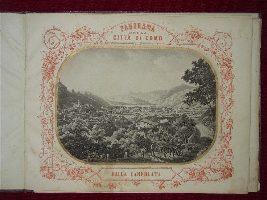 album in-4 (mm. 233x300), pp. 13, bella leg. t. tela ottocentesca con tit. in oro al piatto ant. e impressioni a secco. Belliss. front. in acquatinta con con fregi litogr. ad inchiostro rosso raffigurante la città di Como vista dalla Camerlata. Segue il testo italiano e francese su 2 colonne, quindi 10 splendide doppie tavv. all’acquatinta giunte in un unico foglio a formare una lunga tav. allungabile raffigurante i paesi che si affacciano sul lago visti dalla barca: Como, Cernobbio, Carate, Brienno, Tremezzo, Menaggio, e riscendendo di fronte Bellagio, Lezzeno, Nesso, Careno, Torno, Blevio e ancora Como . Belliss. album in legatura originale, di estrema rarità. [089]