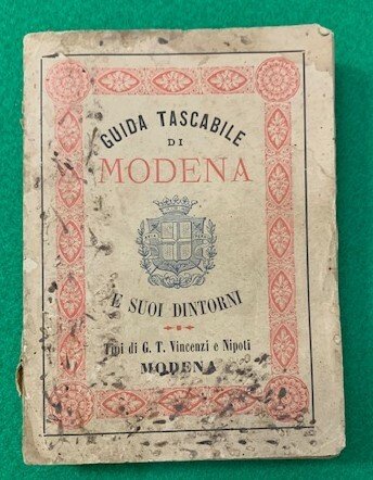 In 8° piccolo; (2 b.), (8), XV, (1), 226, (14 di pubblicità editoriali stampate su carta verde assenti negli altri esemplari censiti in ICCU) pp. e una grande c. di tav. più volte ripiegata con bella carta di Modena, con alcuni edifici con coloritura coeva verde, nel nostro esemplare montata al contrario. Dorso con difetti e piccole mancanze. Tracce di sporco al piatto anteriore dove è presente entro il titolo e lo stemma di Modena entro cornice xilografica, il tutto stampato in rosso e nero. Manca il piatto posteriore. All'interno in buone-ottime condizioni di conservazione. All'antiporta immagine del duomo di Modena. Seconda edizione (anche se una prima edizione non è censita in nessun repertorio bibliografico), rara, di questa guida di Modena scritta dal celebre archeologo e numismatico modenese, Arsenio Crespellani (Modena, 14 dicembre 1828 Modena, 14 marzo 1900) che fu oltre che direttore del Museo Civico di Modena, del Museo lapidario, della Galleria e del Medagliere estensi, anche ispettore regio agli scavi, oltre che membro di svariate organizzazioni scientifiche, dall'Imperiale regio Istituto archeologico germanico di Roma alla Società di storia naturale di Milano e all'Accademia Nuova Fenice di Orvieto. A lui si devono alcuni degli studi archeologici più importanti del territorio modenese dell'ottocento come la scoperta di una strada preromana che illustrò nella sua opera Strada Claudia alle radici dei colli modenesi edita nel 1869. Tra i fondatori del Museo di Bazzano, si occupò della ripresa degli scavi presso la Necropoli etrusca della Galassina. Fu anche sindaco di Savignano sul Panaro (dove nel 1864 riportò alla luce un celebre reperto archeologico, un ripostiglio di asce). Darwiniano convinto non si inserì nelle polemiche susseguite alla traduzione dell'opera di Darwin in italiano ma portò avanti i suoi studi tenendo conto dell'opera di Darwin. Rarità bibliografica. Rif. Bibl.: IT\ICCU\MOD\0419803 .