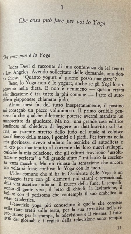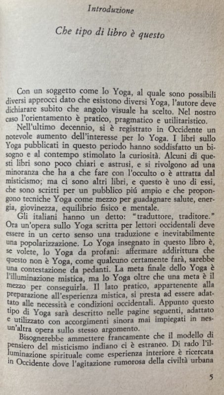 Molti libri sullo Yoga colpiscono per la loro oscurità o perché l'argomento vi è popolarizzato sino al limite del banale. Eccone uno sempre chiaro e di gradevole lettura, ma pieno di informazioni precise su quello che è e quello che non è lo Yoga e sulle sue tecniche, adattate in modo che anche gli occidentali possano ricavarne quei benefici che una tradizione di tremila anni di Yoga ha esaurientemente comprovato. Suo scopo, pratico e non mistico, è di promuovere l'aumento della vitalità, una linea più giovanile in chi l'abbia perduta, l'equilibrio e il relax fisico e mentale. Non si chiede che vi facciate a nodi.