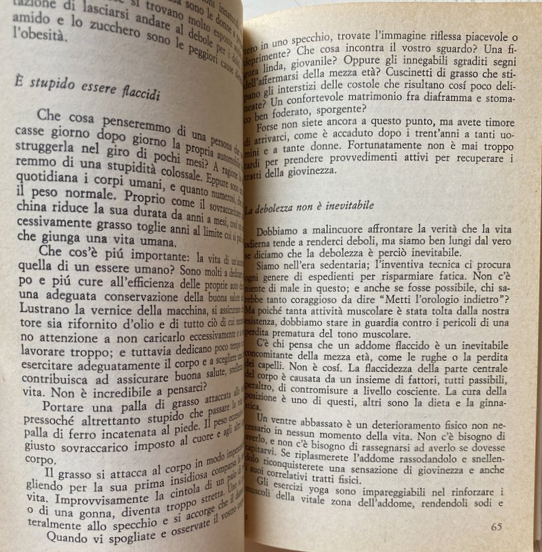 Tutto un franco e illuminante capitolo è dedicato allo Yoga e il sesso, mentre in altri si trovano consigli sulla dieta, la linea e la salute dell'addome, la distensione complessiva della persona.