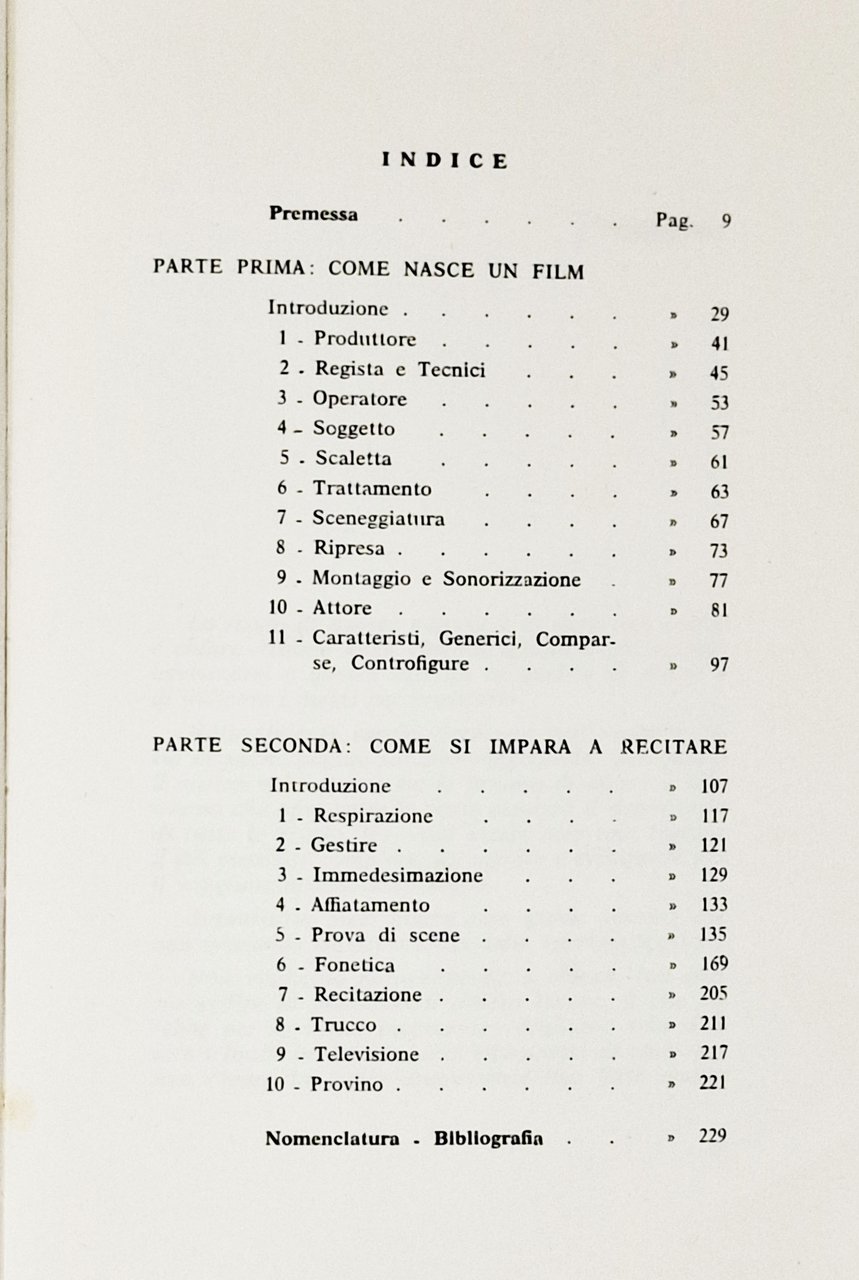 Pagine: 239. Formato: 14 x 21,5 cm circa. Con due tavole illustrate fuori testo. Stato di conservazione: Copertina anteriore leggermente sporca, qualche sporadico ingiallimento nelle pagine interne, una netta 'orecchia' (forse creata appositamente per tenere il segno(sull'angolo superiore del foglio che contiene le due pagine 105 e 106, qualche leggera pieghetta ma, nel complesso, un esemplare buono. Privo di annotazioni, sottolineature o altri segni nel testo. Copertina editoriale flessibile. Dalla Premessa: 'Lo scopo di questo volume è di dare una esatta e chiara visione della cinematografia a chi volesse avvicinarsi a questa attività in qualità di attore e di indicare i mezzi per praticarla. Naturalemnte una così vasta materia in poche pagine sarebbe impossibile; per questo il nostro volume non ha la pretesa di essere il talismano che apre tutte le porte essendo il depositario di tutte le regole. No, vuol essere solo una traccia, il più possibile completa, da seguire e sviluppare per il raggiungimento dello scopo. Soprattutto vuol essere una guida sincera che non nasconda difetti o pregi della carriera d'attore. [.]'. Indice: Premessa; Parte Prima: come nasce un film: introduzione, Produttore, Regista e Tecnici, Operatore, Soggetto, Scaletta, Trattamento, Sceneggiatura, Ripresa, Montaggio e Sonorizzazione, Attore, Caratteristi, Generici, Comparse, Controfigure. Parte Seconda: Come si impara a recitare: Introduzione, Respirazione, Gestire, Immedesimazione, Affiatamento, Prova di scene, Fonetica, Recitazione, Trucco, Televisione, Provino. Nomenclatura - Bibliografia.