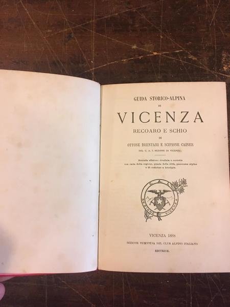 In-16°, pp. 251, tela editoriale rossa con titolo e stemma della Sezione Vicentina del CAI in oro. 33 vedute fotografiche in b.n. f.t., 1 carta di Vicenza, 1 grande tavola litografica ripiegata in fine raffigurante i Monti a nord di Vicenza: (panorama preso dalla Villa Tecchi sul Monte Berico). Perfetto esemplare. Seconda edizione riveduta e corretta.