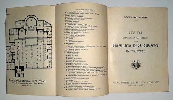 Un volume, 14 x 19 cm pp. 151, (1); 48 tavole in b/n (comprendenti alcune fotoriproduzioni e alcune tav. più volte ripiegate); leg. rigida in tela editoriale, titoli e foto b/n al piatto anteriore ed elenco pubblicazioni editoriali al piatto posteriore; guardie marmorizzate, tagli colorati in rosso. Prima edizione; guida turistica relativa alla Basilica di San Giusto a Trieste. Rif.: IT\ICCU\VEA\0098569. Cond.: opera in buone condizioni generali.