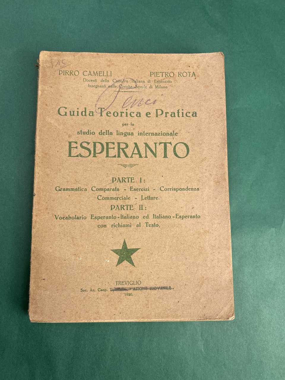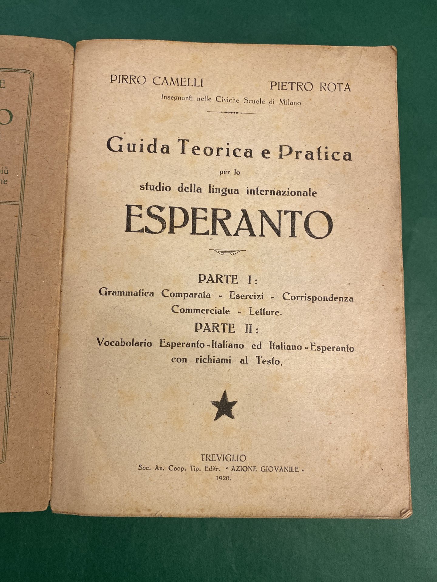 Vol. unico composto da parte I (Grammatica comparata, esercizi, corrispondenza commericale, letture) e parte II (Vocabolario esperanto - italiano ed Italiano - esperanto con richiami al testo), in -16, pp. 272, bros. edit. pagine e piatti legg. bruniti, firma di appart. al piatto ant. e qualche segno d'uso.
