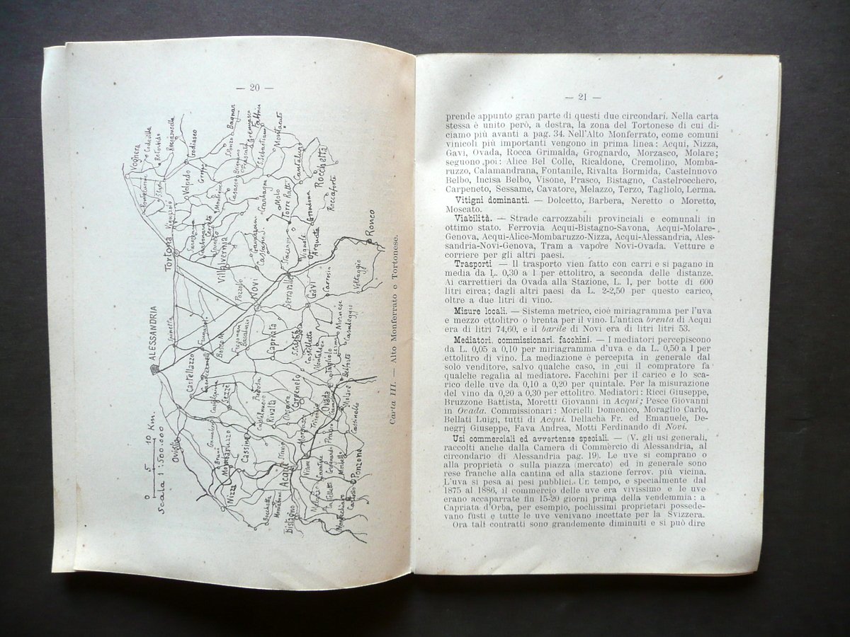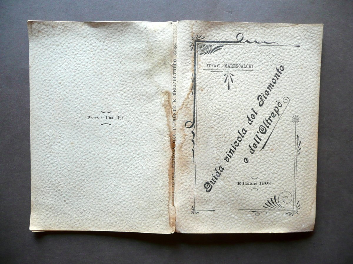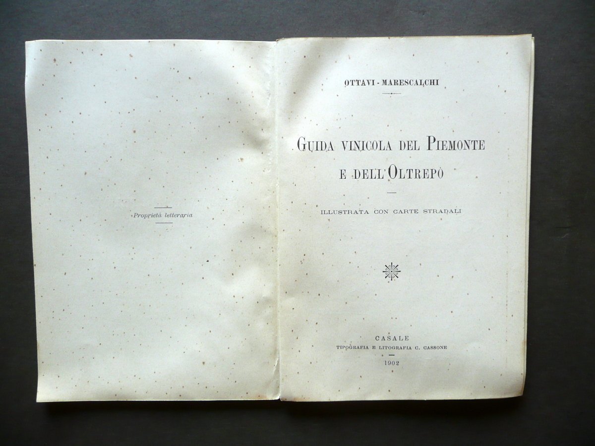 Ottavi - Marescalchi, Guida vinicola del Piemonte e dell'Oltrepò Illustrata con carte stradali Tipografia e Litografia C. Cassone, Casale 1902; cm 17,5x12; pp. 56-10 (inserzioni pubblicitarie in b/n), con VII carte in b/n nel t.; brossura ed. Condizioni di conservazione Esemplare complessivamente ben conservato con tracce d'uso e qualche piccola lieve brunitura; margini e angoli dell'esemplare con leggere gore di vecchia umidità, molto più marginali e lievi agli interni, che non compromettono la lettura del testo (vedi foto); cerniera ant. con fessurazione di alcuni cm alla parte inf., cuciture leggermente allentate. SETT140.L13821 N P